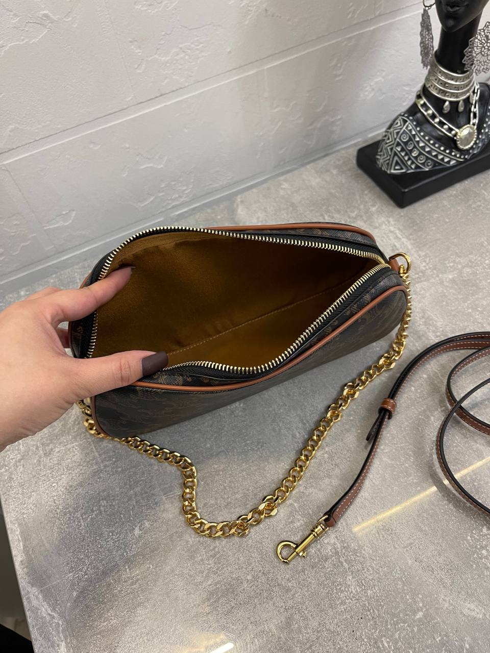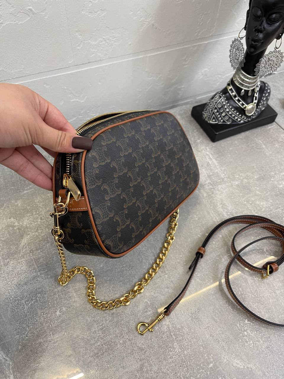Сумка женская Celine LUX-97257 представляет собой элегантный аксессуар, выполненный в классическом стиле. Она выполнена в темно-коричневом цвете с фирменным узором бренда. Сумка подойдет как для повседневной носки, так и для особых случаев.