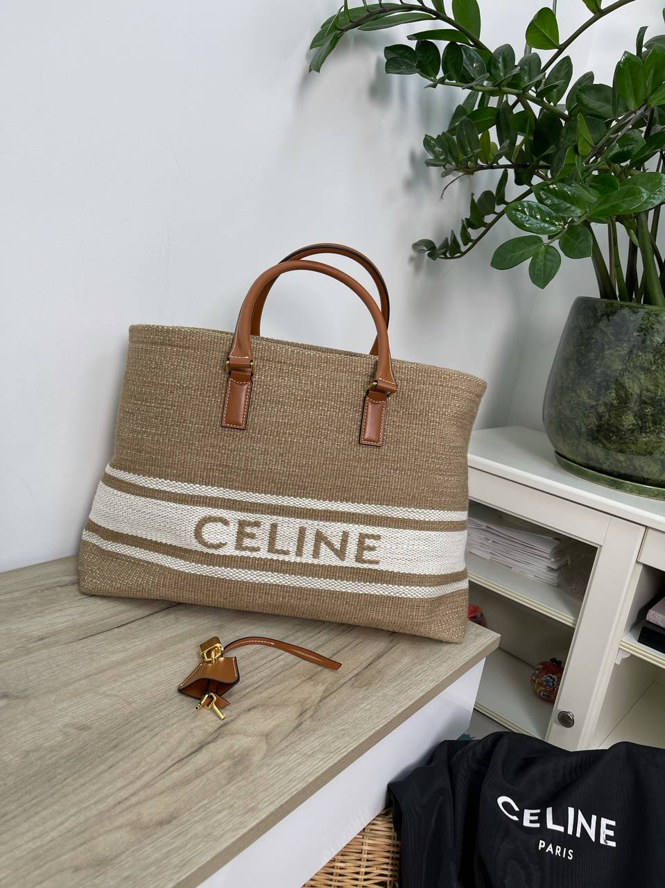 Сумка женская Celine LUX-71395 - это элегантная сумка-шоппер, выполненная в нейтральных тонах с акцентом на брендинг. Сумка имеет прямоугольную форму с двумя ручками, удобными для ношения на плече или в руке. Основной цвет сумки – бежевый, с контрастной белой полосой и надписью «CELINE».