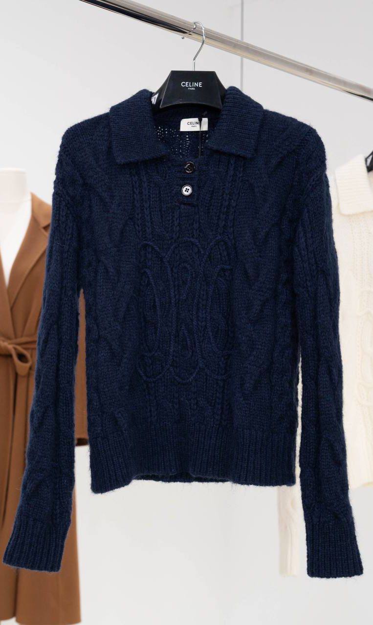 Свитер Celine – это стильный и уютный предмет гардероба, который добавит элегантности в повседневный образ. Изделие выполнено в темно-синем цвете с узором в виде кос и дополнено застежкой на пуговицы.