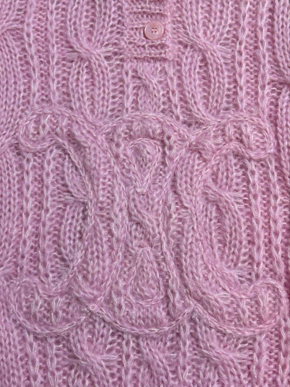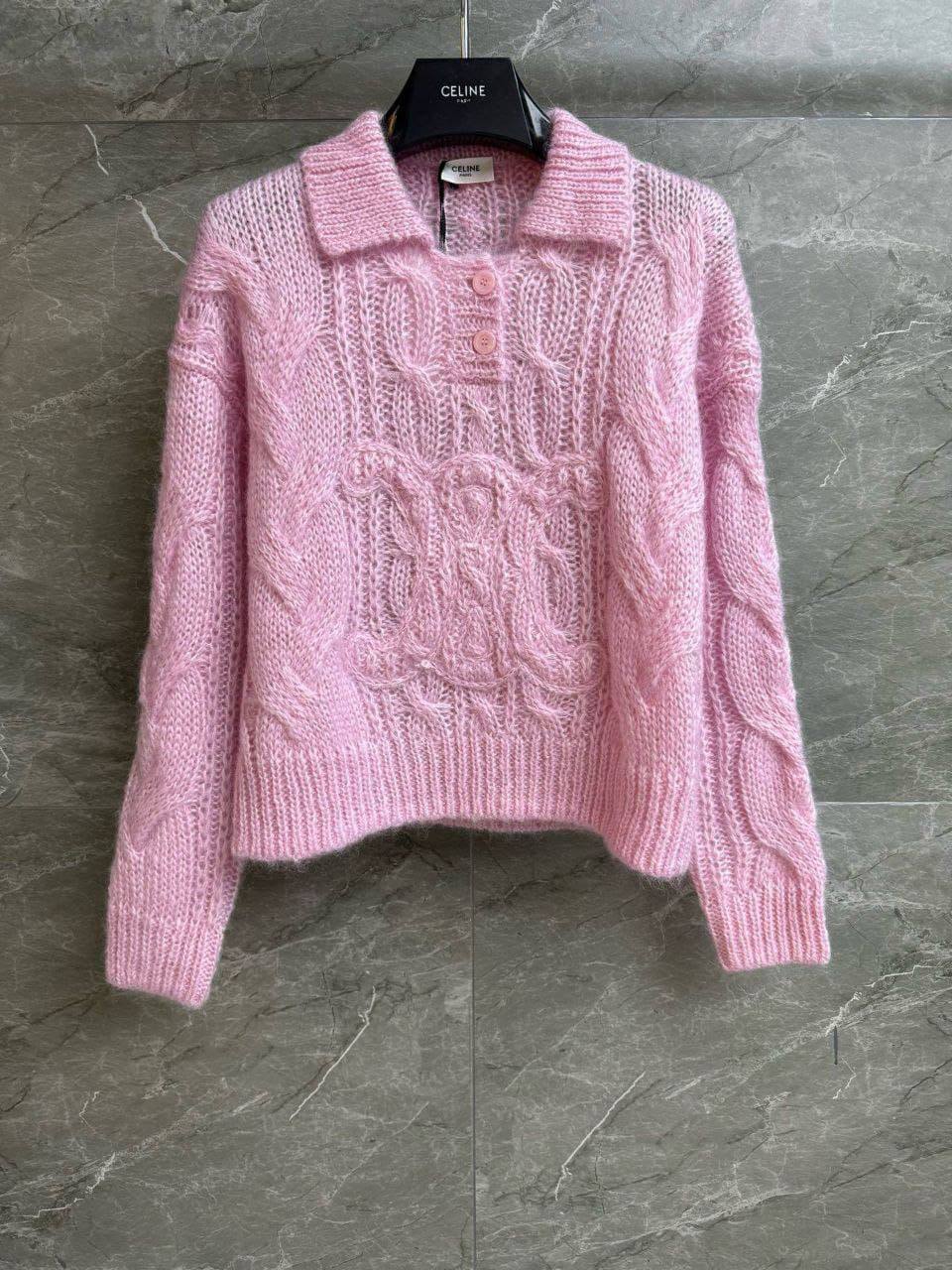 Celine свитер LUX-127194 выполнен в нежном розовом оттенке и украшен узором вязки спереди. Модель с отложным воротником и пуговицами создает расслабленный и уютный образ.