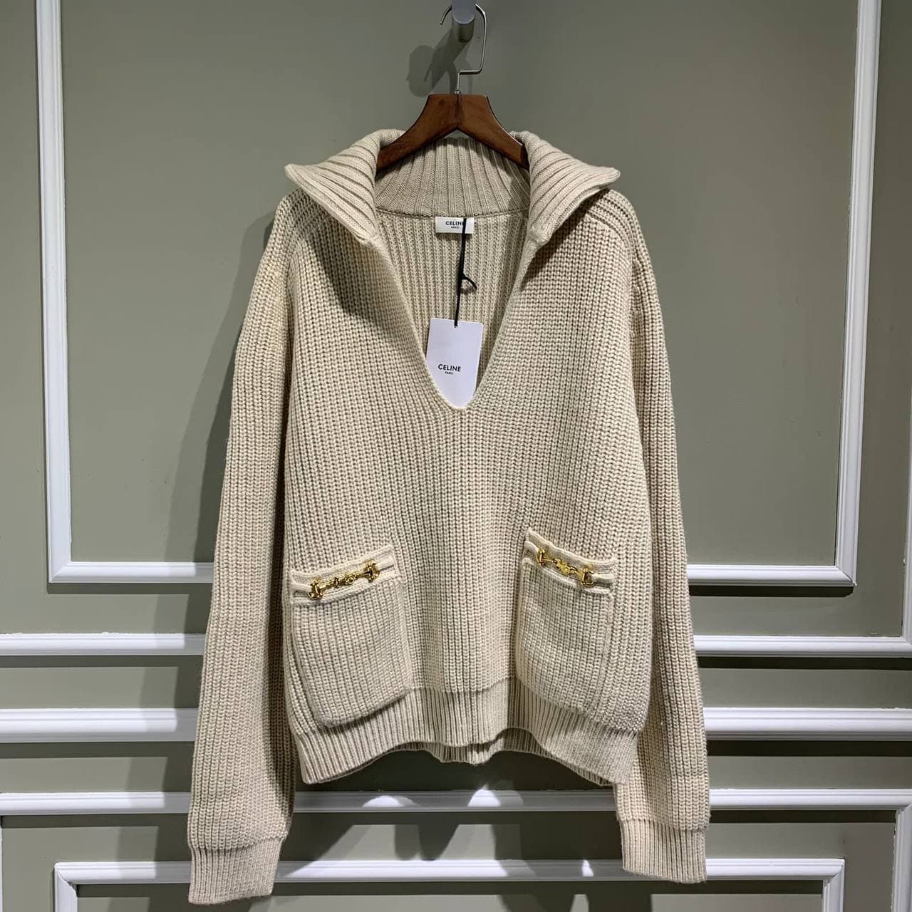 Свитер женский Celine LUX-58182 представляет собой элегантное и стильное дополнение к гардеробу. Модель выполнена в классическом бежевом цвете и имеет свободный крой, что обеспечивает комфорт и свободу движений. Оригинальные детали, такие как накладные карманы с золотистой фурнитурой, придают свитеру особый шик и изысканность, делая его заметным элементом образа.