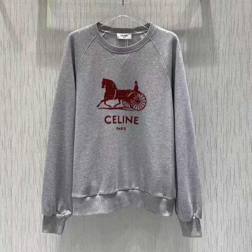 Эта женская толстовка Celine LUX-42197 выполнена в классическом сером цвете и украшена стильным принтом с изображением лошади и кареты, а также логотипом бренда. Модель сочетает в себе повседневный комфорт и элегантность, что делает ее универсальным элементом гардероба. Идеально подходит для создания расслабленных, но модных образов.