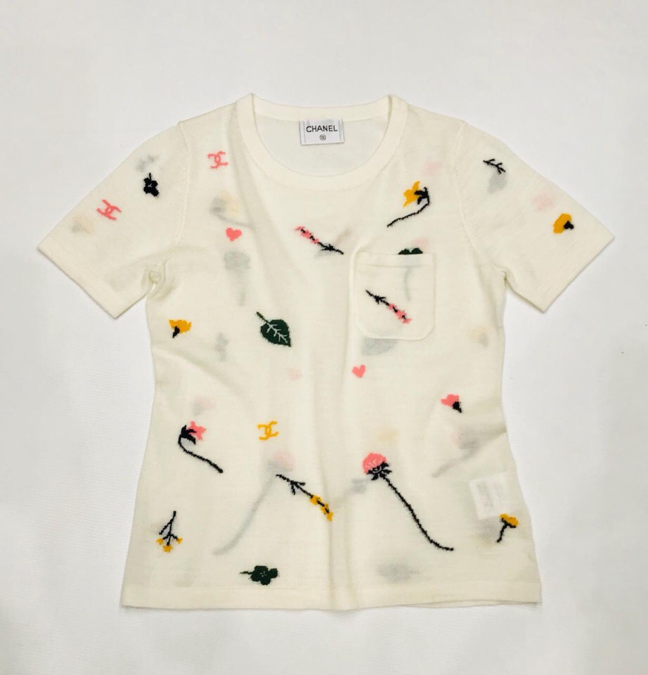 Эта футболка Chanel ОДЖ-078 представляет собой элегантное изделие с уникальным дизайном. Модель выполнена в кремовом цвете и украшена вышивкой в виде цветов, листьев, сердец и логотипа бренда, создавая легкий и романтичный образ. Футболка идеально подойдет для создания стильных повседневных и вечерних нарядов.