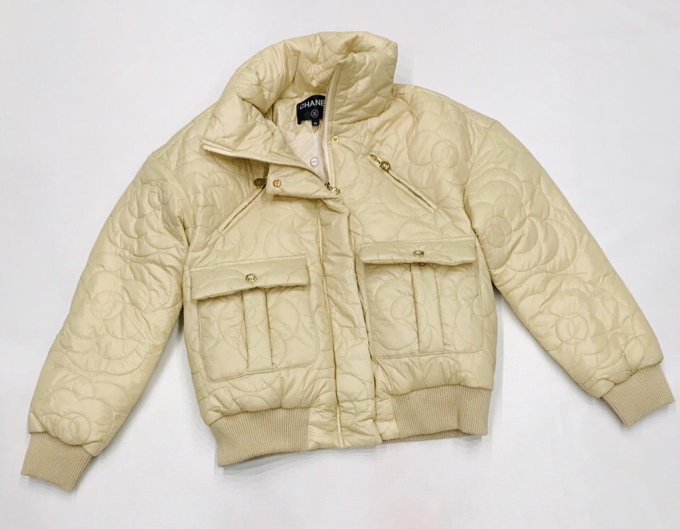 Эта женская куртка Chanel ОДЖ-295 выполнена в кремовом цвете и украшена характерной стежкой в виде цветка камелии, придающей ей элегантный и узнаваемый вид. Модель имеет объемный воротник, застежку-молнию и удобные накладные карманы, декорированные золотистыми пуговицами с логотипом бренда. Резинки на манжетах и по низу изделия обеспечивают дополнительный комфорт и защиту от ветра. Эта куртка идеально подойдет для создания стильных и уютных образов в стиле casual.