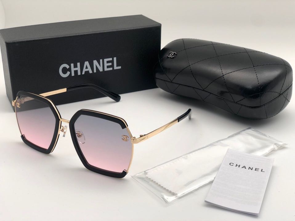 Стильные женские солнцезащитные очки Chanel LUX-8553 в черной оправе с золотистыми элементами и градиентными линзами от розового до серого. Очки имеют современный дизайн, подчеркивающий элегантность и изысканность.