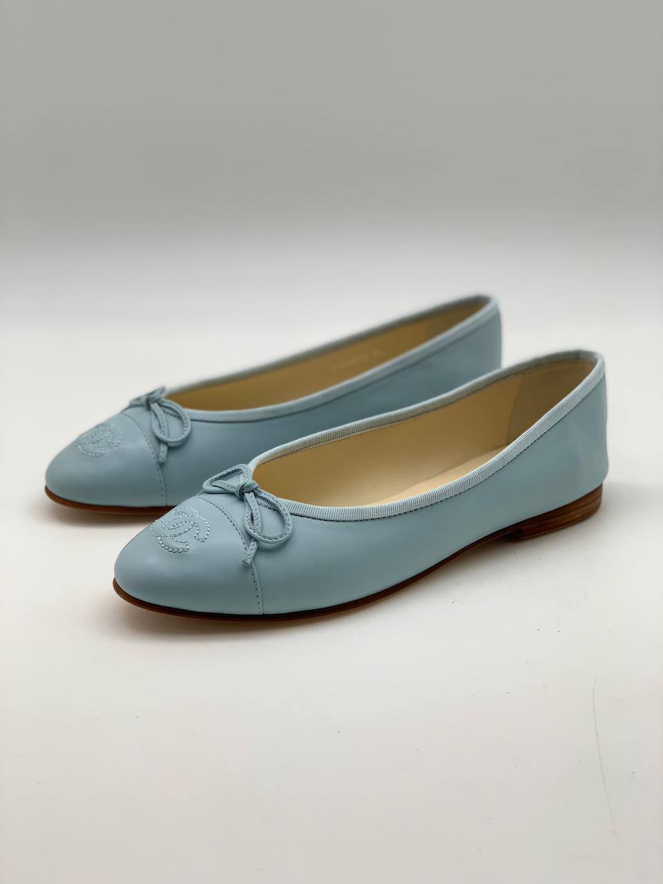 Балетки Chanel LUX-51298 представляют собой элегантную и женственную обувь, выполненную в классическом стиле. Нежный голубой цвет и изящный бант с узнаваемым логотипом бренда создают утонченный образ. Эти балетки идеально подойдут для повседневного ношения, добавляя шика любому наряду.