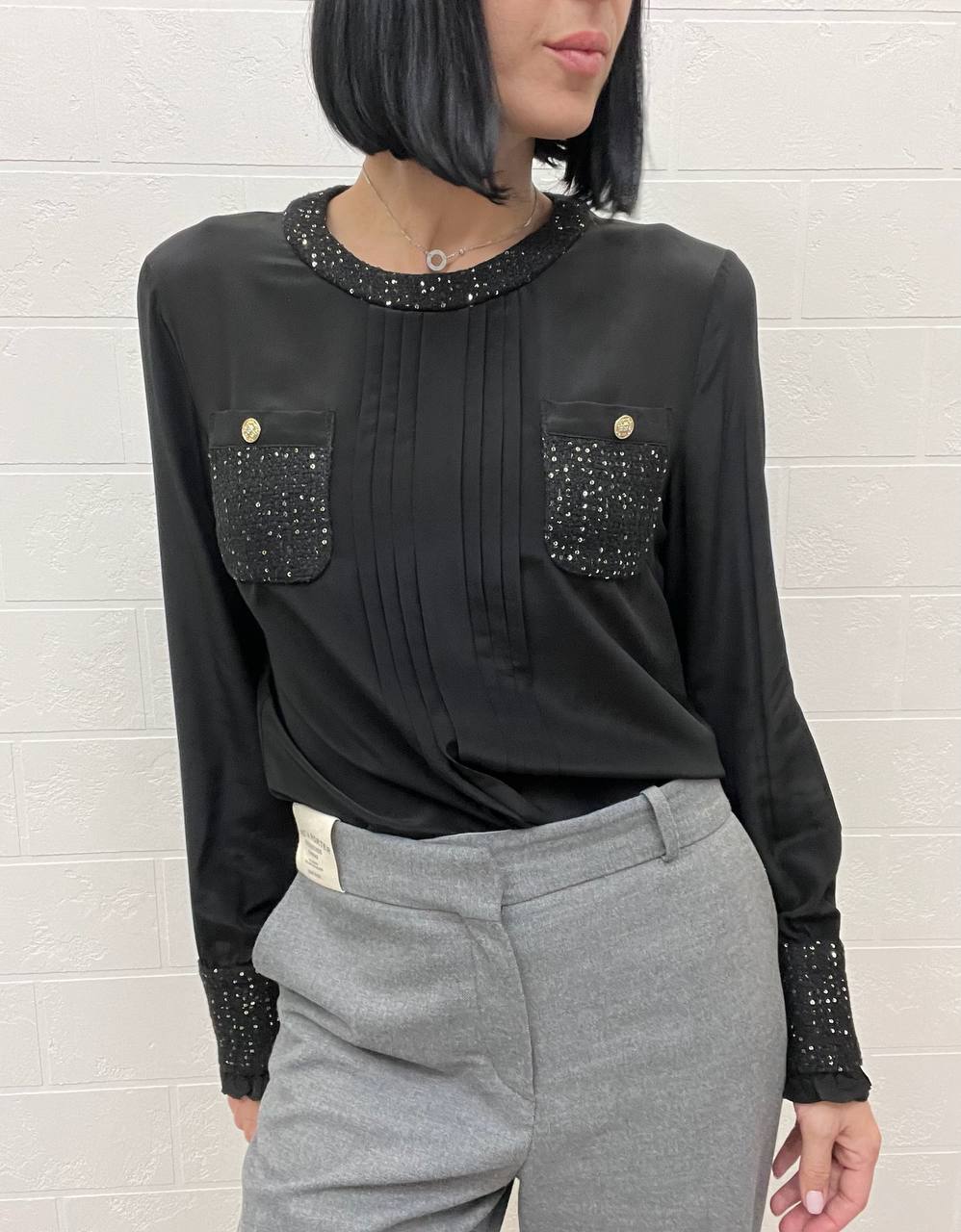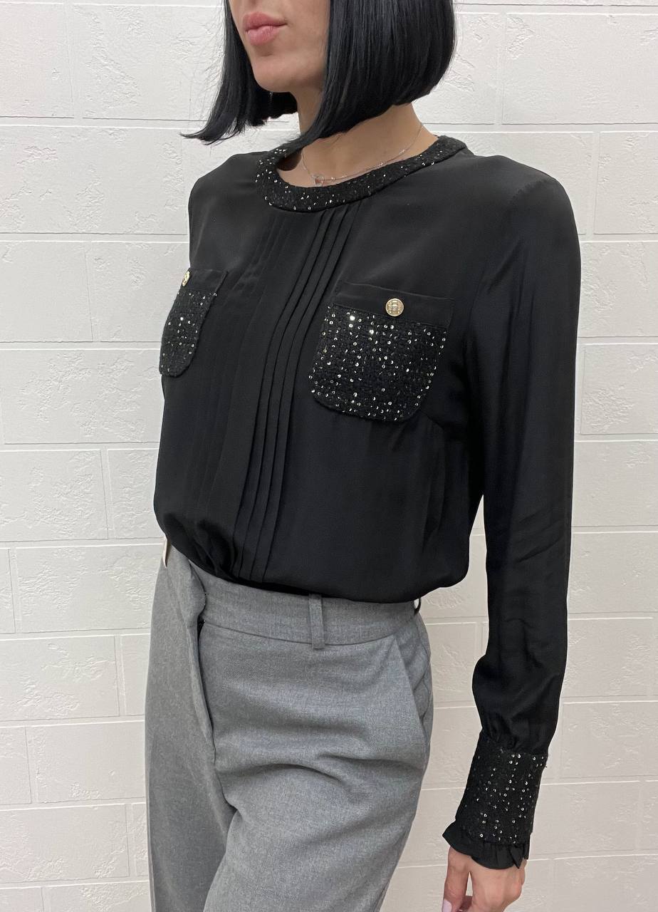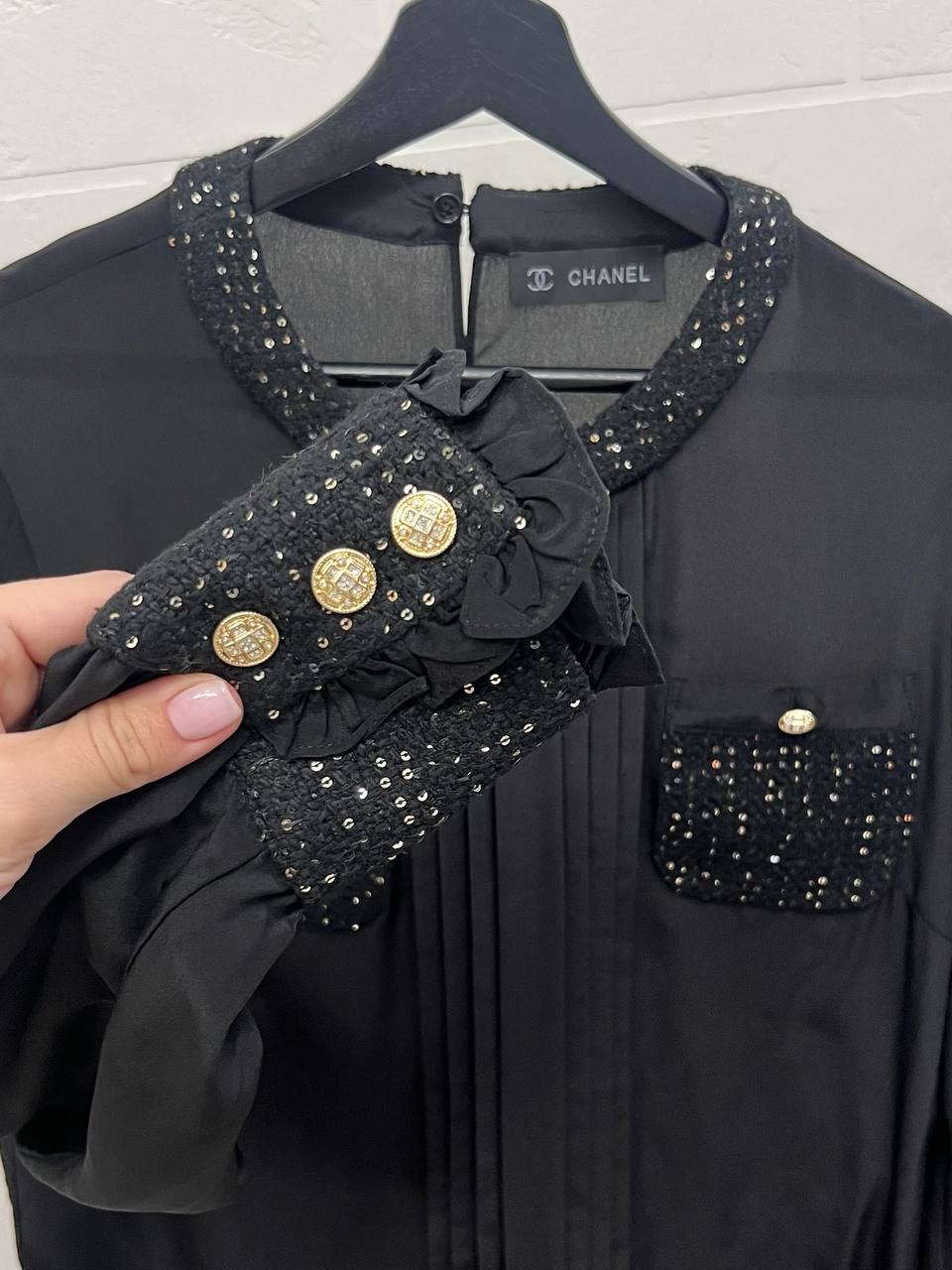 Блузка Chanel LUX-109334 — это элегантная черная блузка с длинными рукавами. Она выполнена в классическом стиле, имеет круглый воротник и украшена декоративными элементами. Идеально подойдет для создания стильного и изысканного образа.