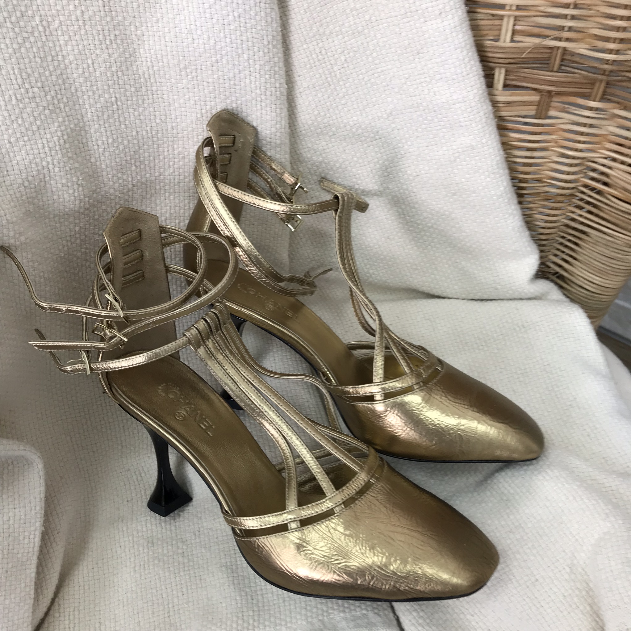 Эти изысканные босоножки Chanel LUX-17176, выполненные в насыщенном золотом цвете, станут элегантным дополнением к вашему гардеробу. Их дизайн с тонкими ремешками и квадратным мысом придает им утонченность, идеально подходящую для особых случаев или вечерних выходов.