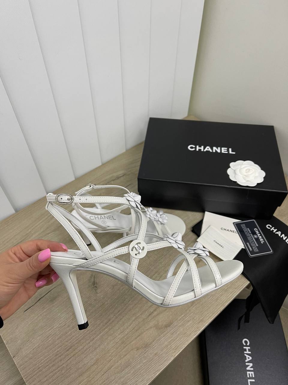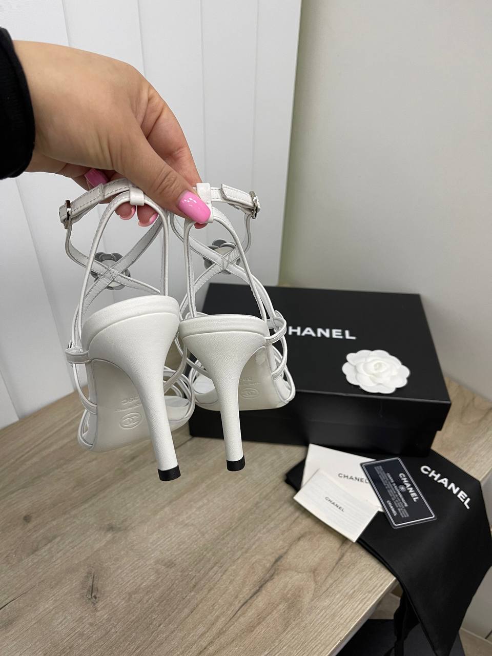 Босоножки Chanel LUX-85790 – это элегантная модель, выполненная в минималистичном дизайне. Белые босоножки на высоком каблуке с тонкими ремешками и изящными декоративными элементами. Идеальный выбор для создания утонченного и запоминающегося образа.