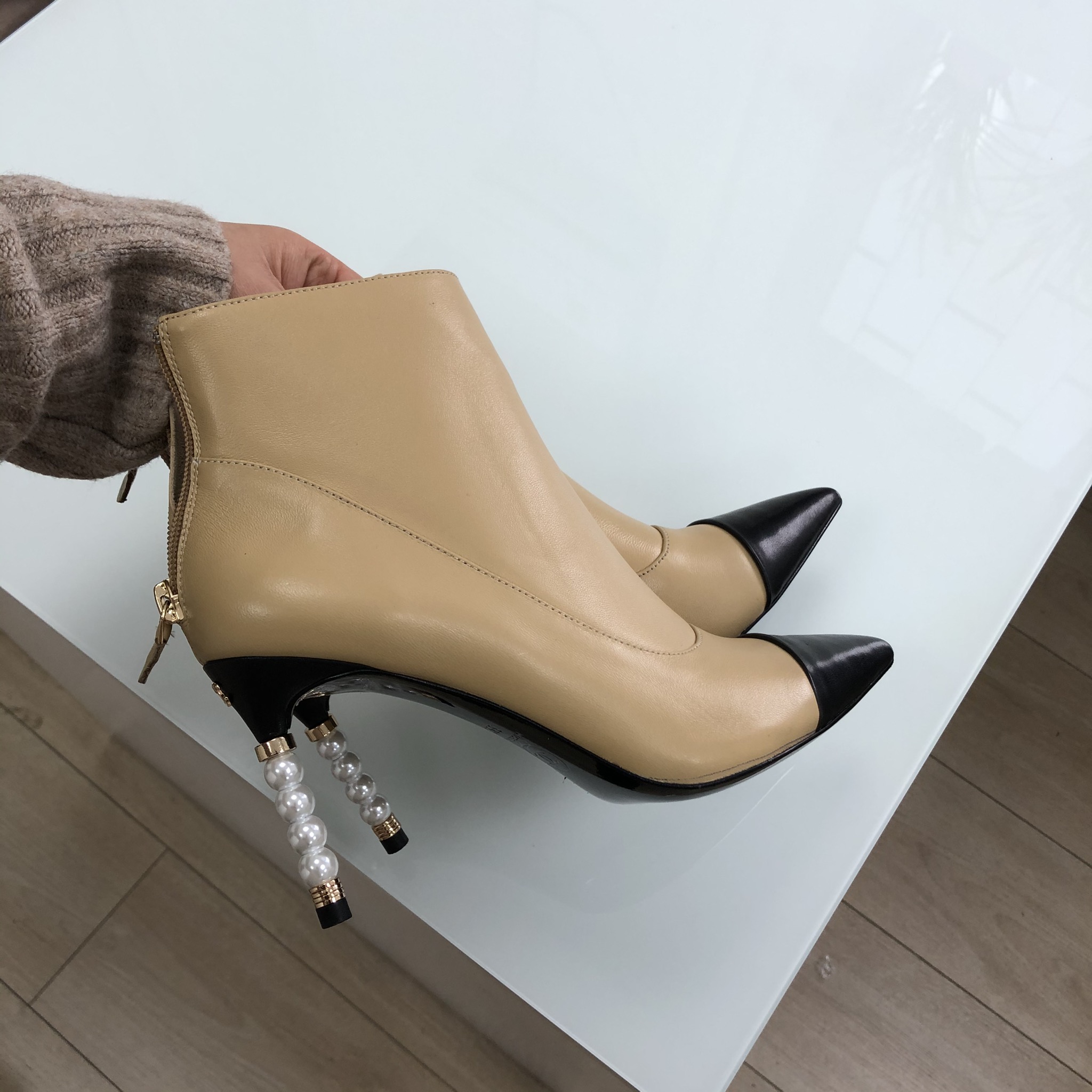 Ботильоны Chanel LUX-26840 – элегантная модель, сочетающая классический дизайн с изысканными деталями. Кожаный верх, выполненный в двух контрастных цветах, придает обуви утонченный вид. Акцент сделан на оригинальный каблук, декорированный жемчугом и золотистыми элементами, что добавляет изысканности и роскоши.