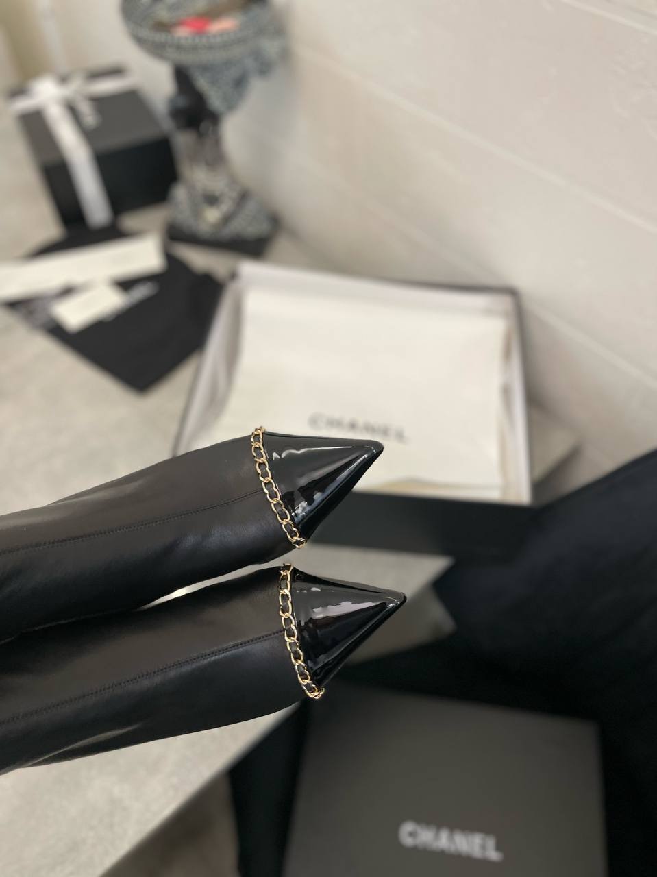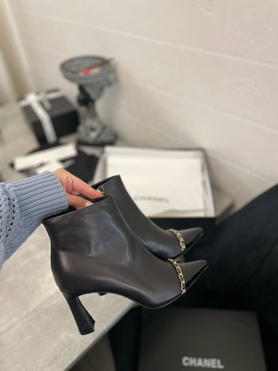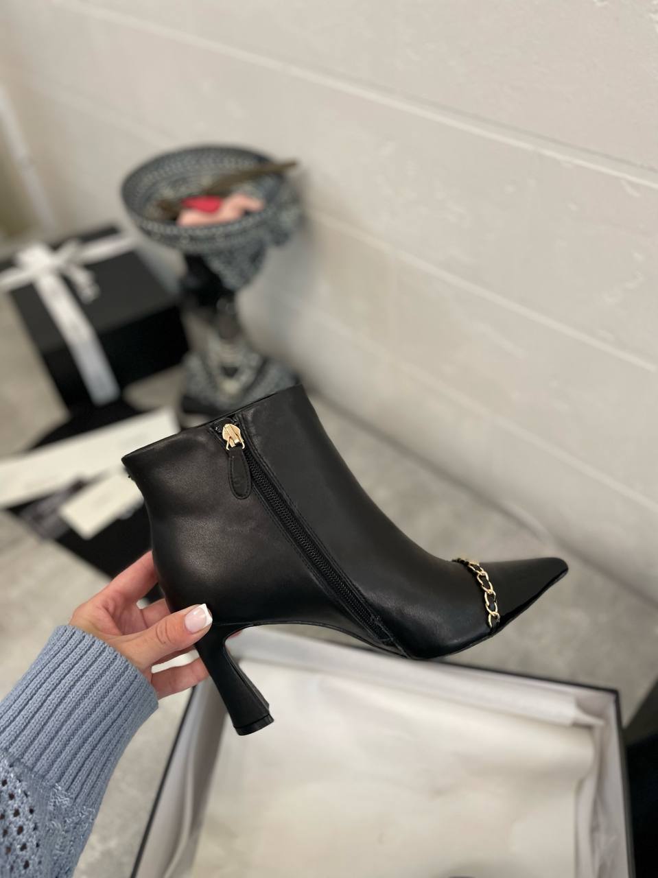 Ботильоны Chanel LUX-98712 — это элегантная модель, сочетающая в себе изысканность и современный стиль. Чёрные ботильоны с острым мыском и деталями в виде золотой цепочки подчеркивают женственность и утонченный вкус. Идеально подходят для создания стильных образов на каждый день.