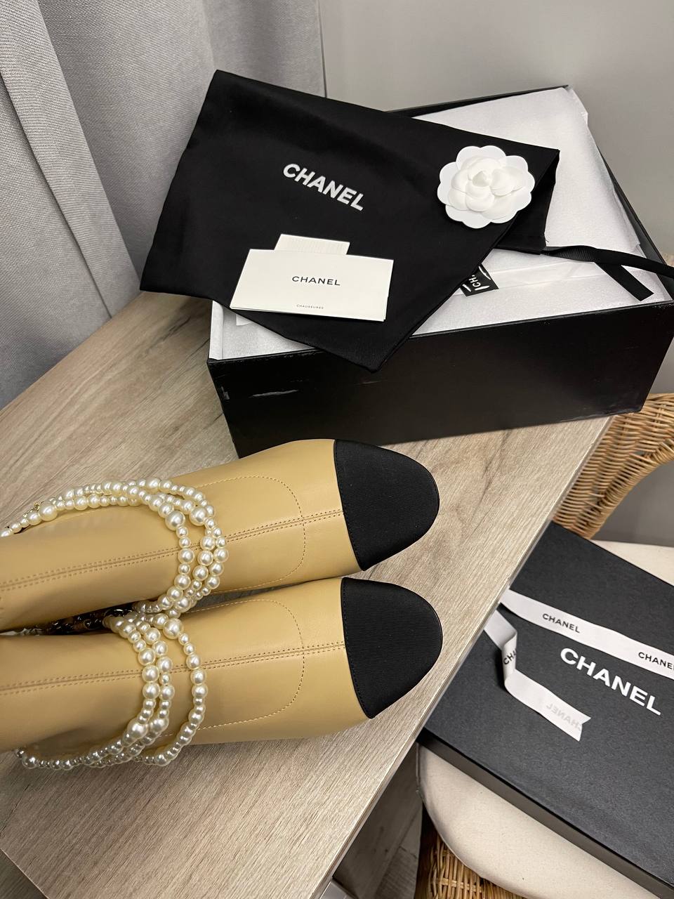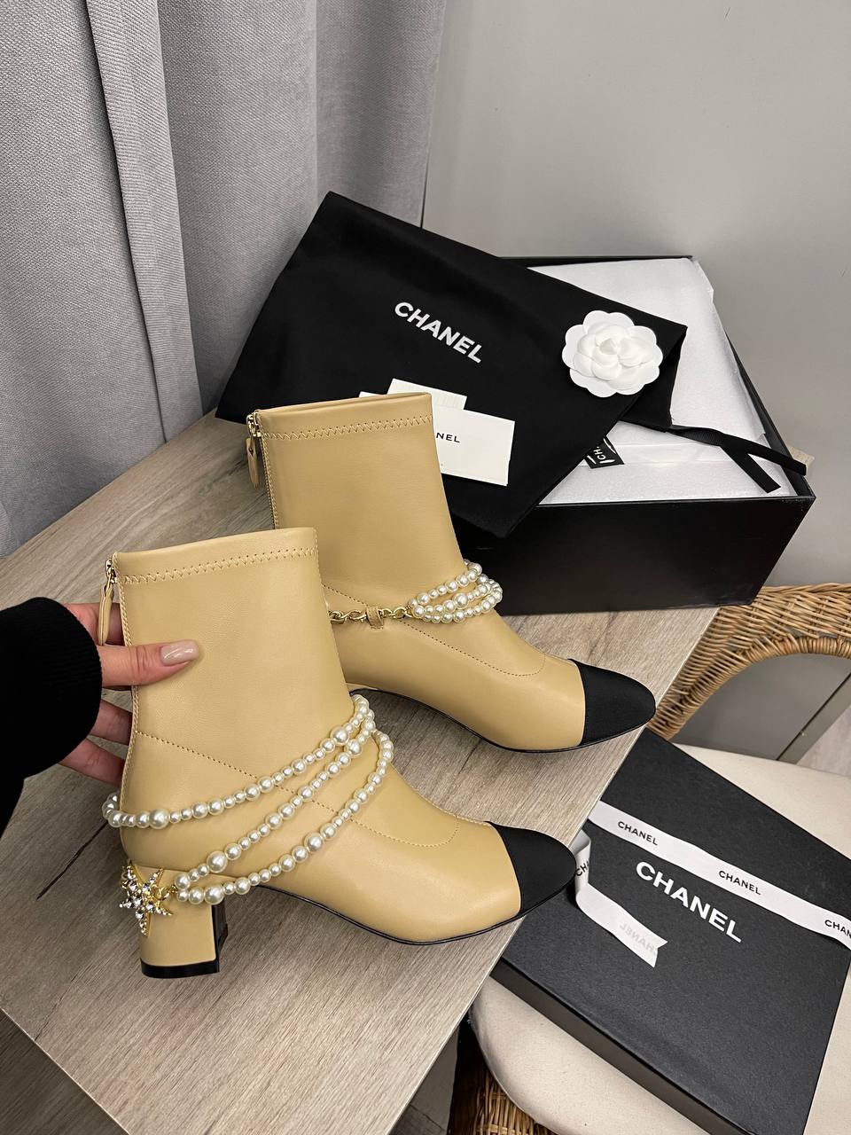 Ботильоны Chanel LUX-112477 – это элегантная обувь, сочетающая в себе классику и современность. Основной цвет ботильонов — бежевый, с черным носком. Дизайн дополняют декоративные жемчужные бусы, что придает им изысканный вид.