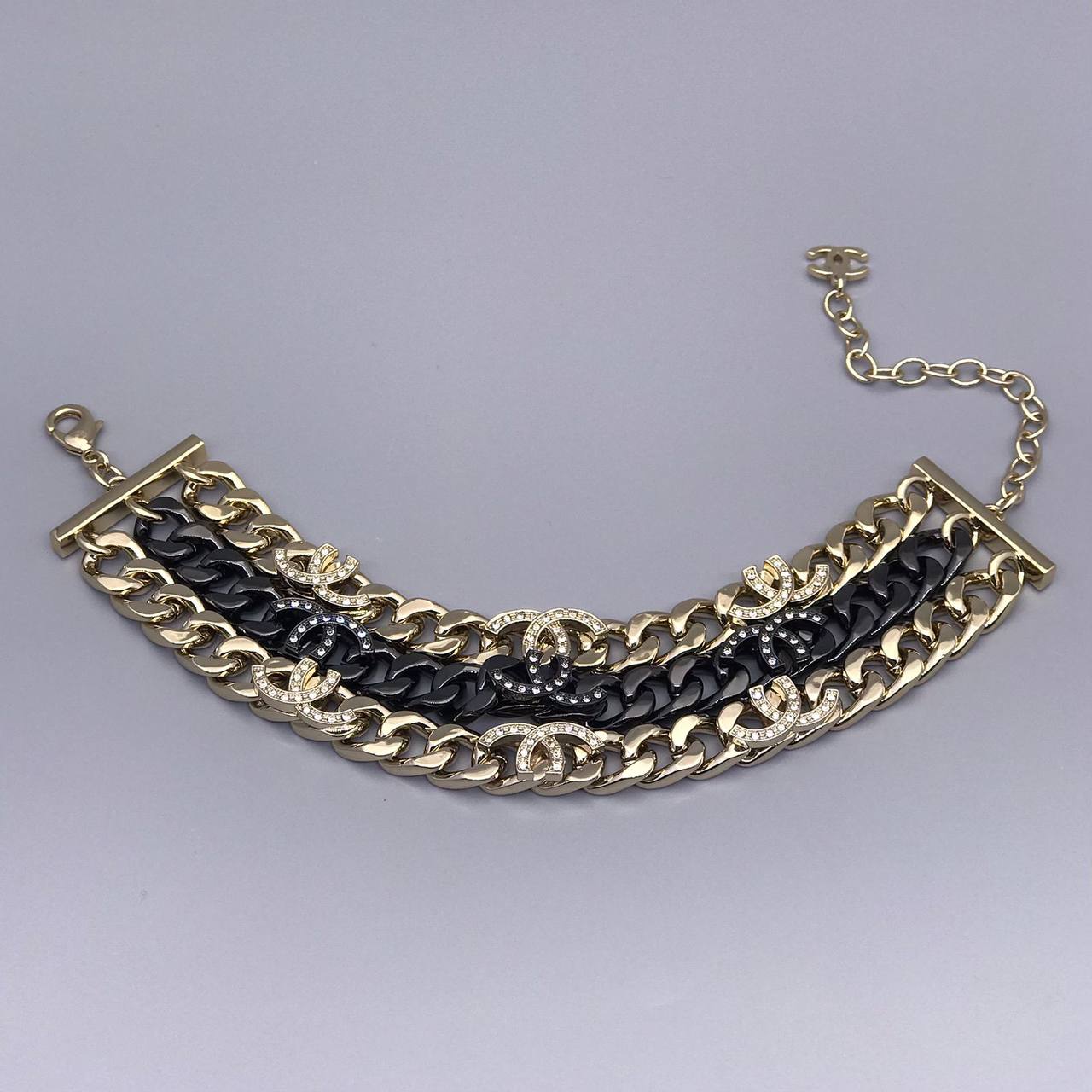 Браслет Chanel LUX-83638 – изысканный аксессуар, сочетающий в себе роскошь и современность. Браслет выполнен в многослойном дизайне, с чередованием чёрных и золотистых звеньев, украшенных узнаваемым логотипом. Элегантное украшение идеально дополнит как повседневный, так и вечерний образ.