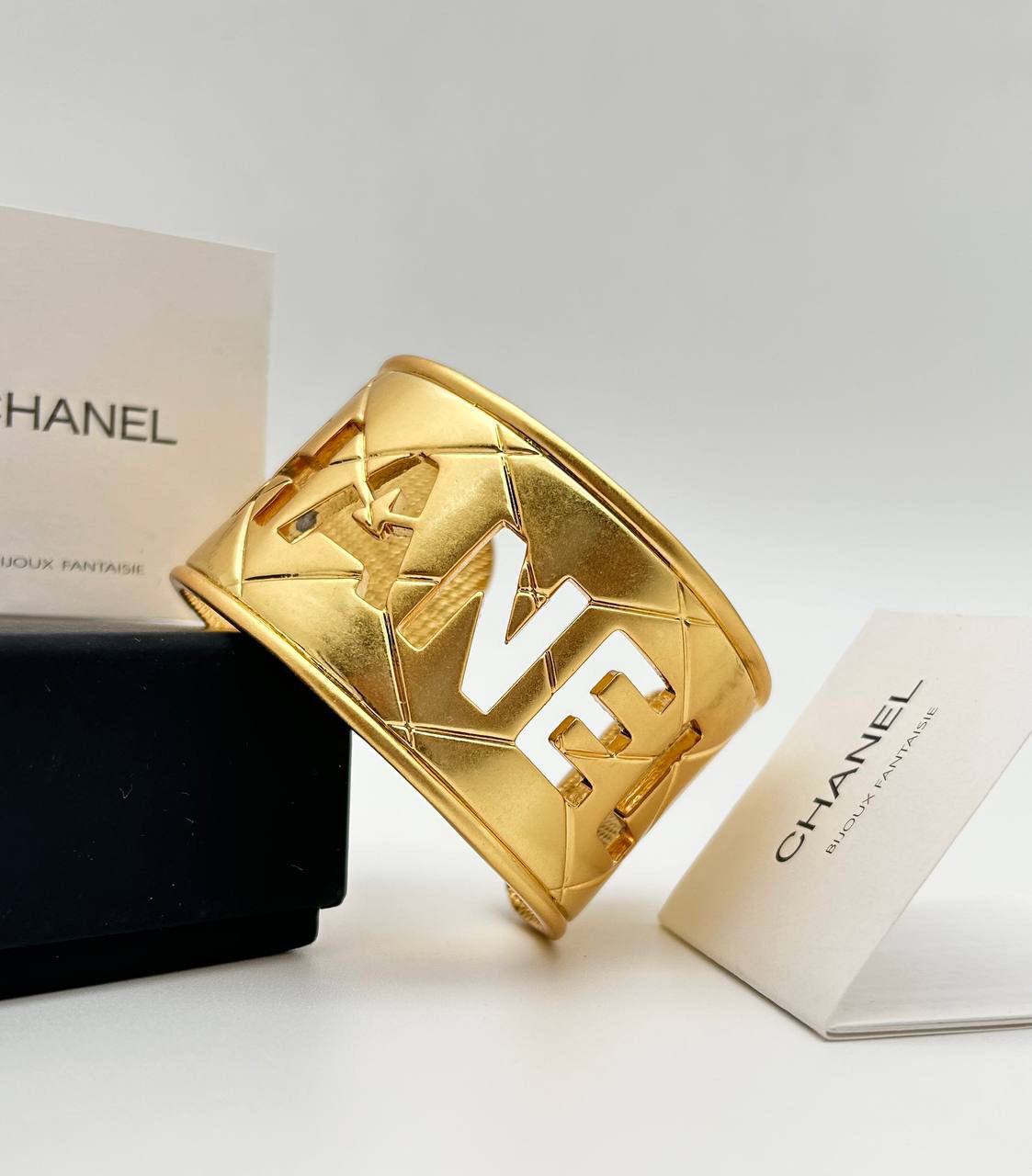 Браслет Chanel LUX-113420 - это изысканное украшение в фирменном стиле бренда. Браслет выполнен в золотистом цвете с надписью "CHANEL" с белыми вставками, что придает ему элегантность и узнаваемость. Дизайн браслета сочетает в себе классику и современность, делая его идеальным аксессуаром для различных образов.