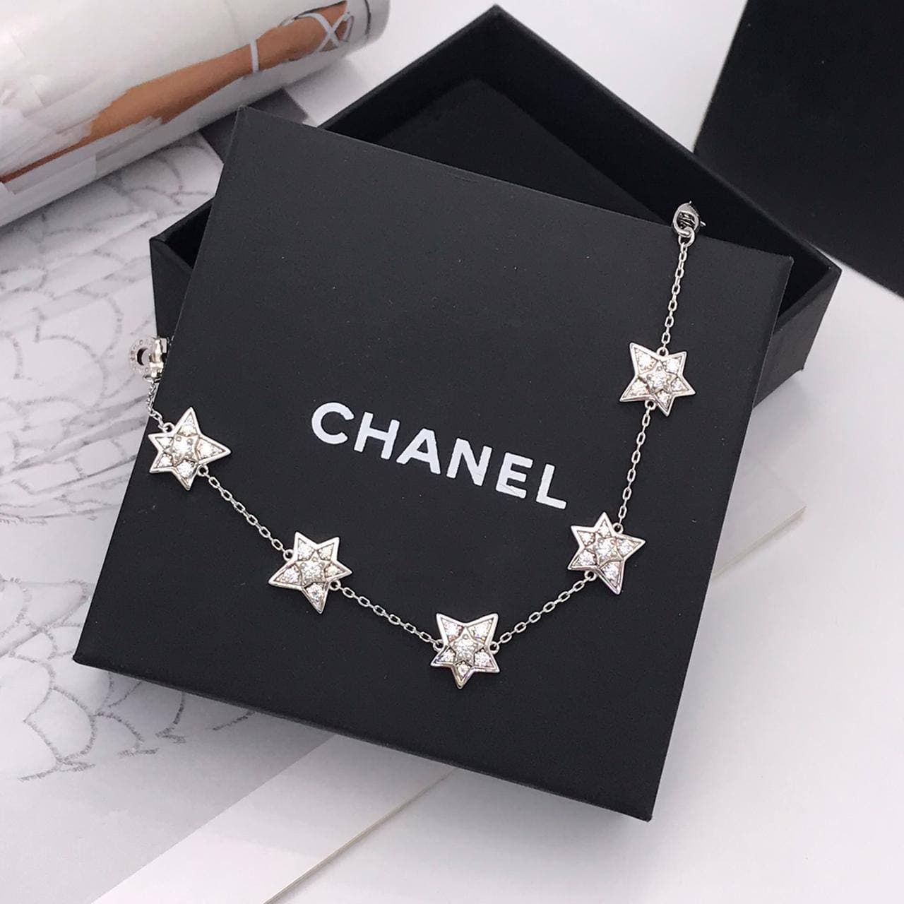Браслет Chanel LUX-59874 представляет собой изящное украшение в классическом стиле. Нежный дизайн с подвесками в виде звезд, инкрустированных кристаллами, придает браслету особую привлекательность. Этот аксессуар станет элегантным дополнением к любому образу, подчеркивая вашу индивидуальность и изысканный вкус.