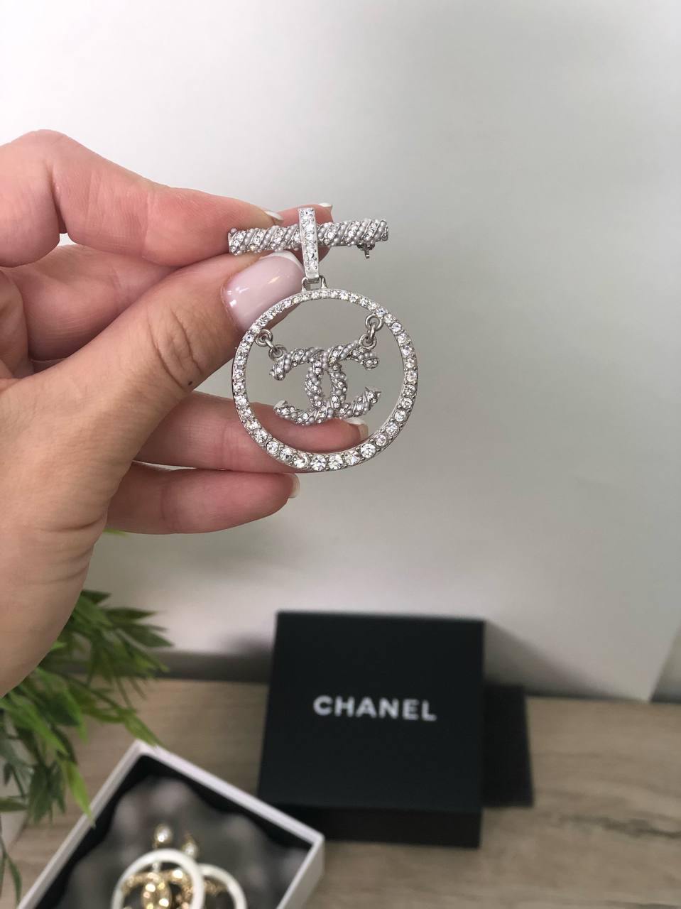 Эта изысканная брошь Chanel LUX-52601 представляет собой элегантное украшение, выполненное в классическом стиле бренда. Круглый медальон, инкрустированный мерцающими кристаллами, украшен узнаваемым логотипом Chanel, выполненным в виде переплетенных букв "C" и стилизованной веревки. Крепление броши также декорировано кристаллами, добавляя изделию роскоши и изящества.