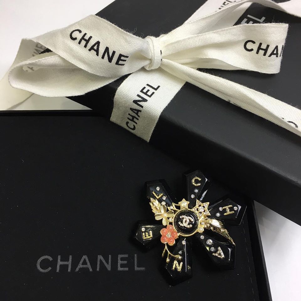 Эта изысканная брошь Chanel LUX-26383 представляет собой настоящее произведение искусства, выполненное в стиле, который мгновенно узнаваем благодаря знаменитому бренду. Черная основа украшена золотистыми элементами, сияющими кристаллами и нежным персиковым цветком, создавая образ элегантности и утонченности. Брошь декорирована буквами, составляющими название бренда, и фирменным логотипом Chanel, что подчеркивает ее эксклюзивность.