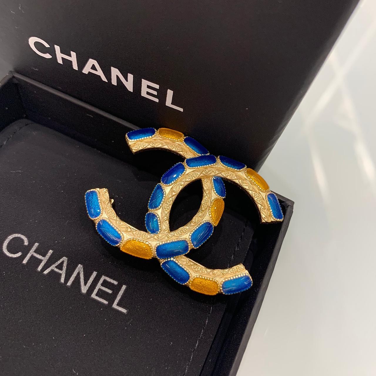 Элегантная брошь Chanel LUX-35586 представляет собой роскошный аксессуар, выполненный в узнаваемом стиле бренда. Это изысканное украшение, украшенное эмалью синего и золотистого цветов, идеально подойдет для тех, кто ценит классику и утонченность.