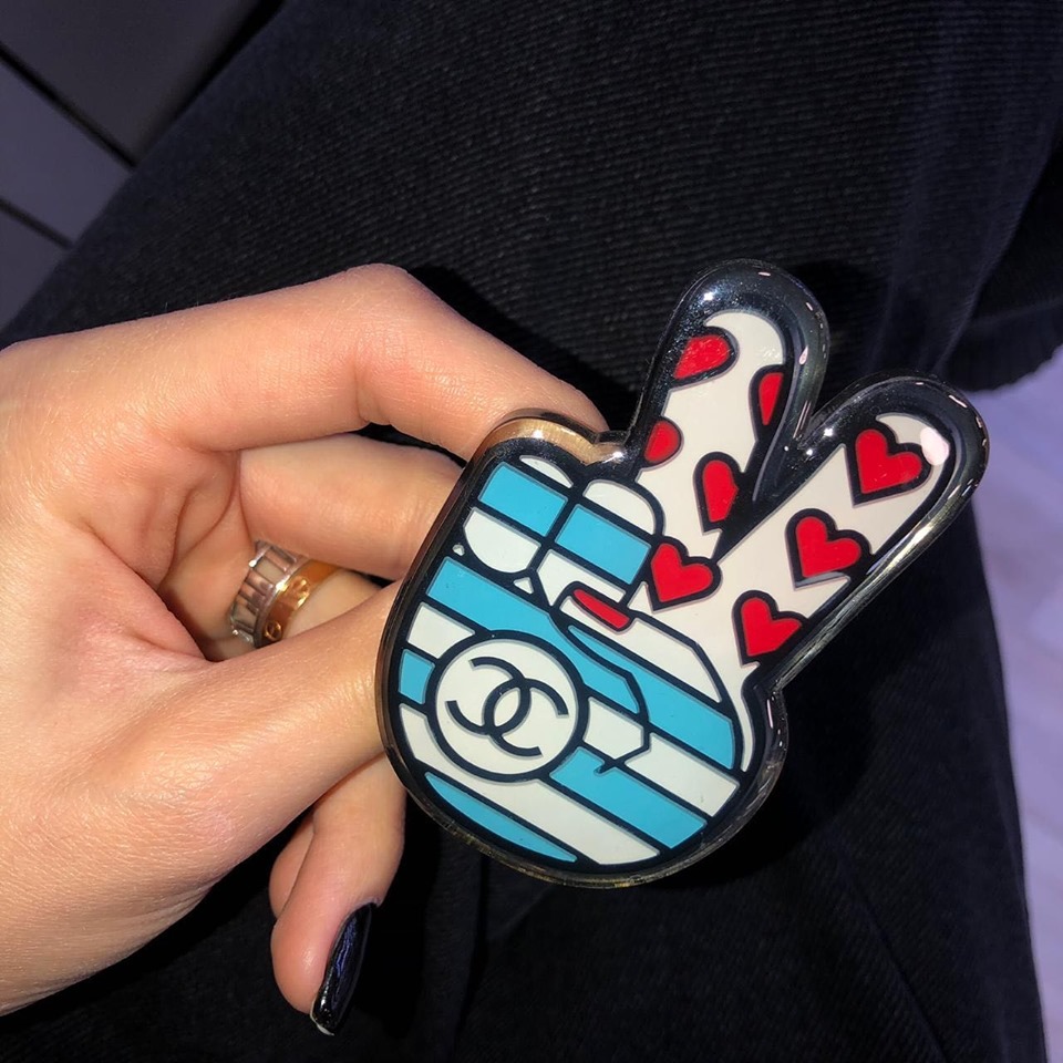 Эта брошь Chanel LUX-21896 представляет собой стильный аксессуар в форме знака победы, украшенный ярким принтом. Дизайн броши включает в себя чередующиеся синие и белые полосы, а также изображение красных сердечек, наполняющих пространство между пальцами. Логотип Chanel, выполненный в классической форме, элегантно размещен в нижней части изделия.