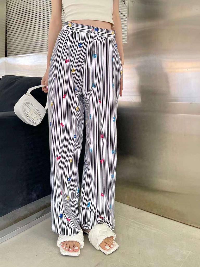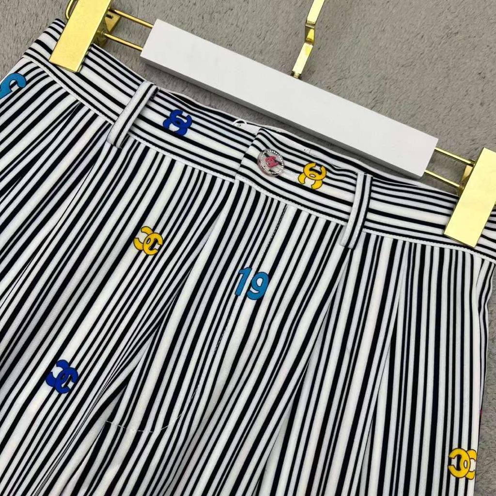 Брюки Chanel LUX-84669 — это стильные брюки прямого кроя от известного бренда. Они выполнены в черно-белую полоску с разноцветными вышивками логотипов. Эта модель станет отличным выбором для создания как повседневных, так и более элегантных образов.