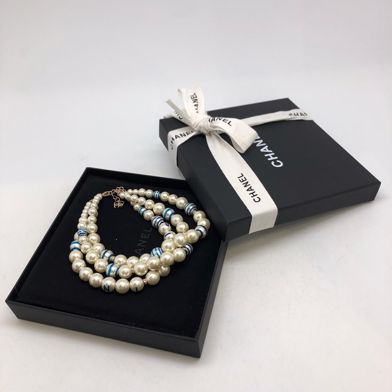 Бусы Chanel LUX-39343 — это элегантное ювелирное изделие, выполненное в классическом стиле, с добавлением современных элементов. Многоярусное ожерелье из жемчужин кремового цвета дополнено декоративными бусинами с сине-белыми полосами, создающими игривый контраст. Это украшение станет изысканным акцентом любого образа, придавая ему утонченность и шарм.