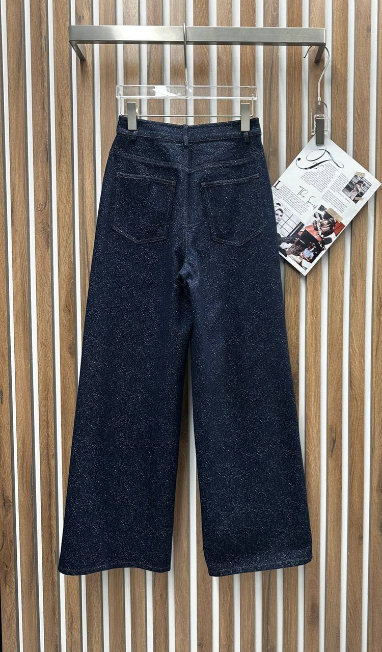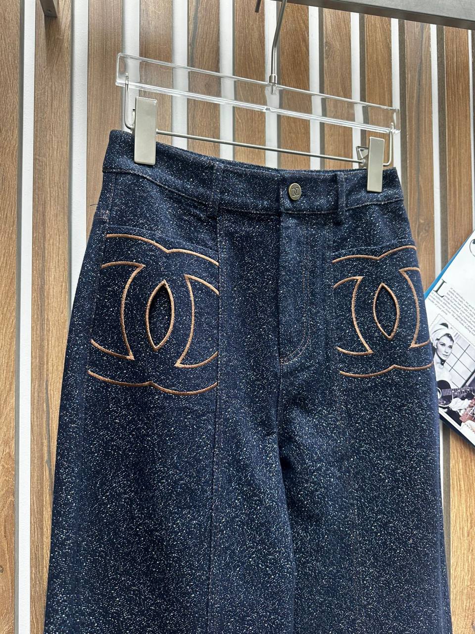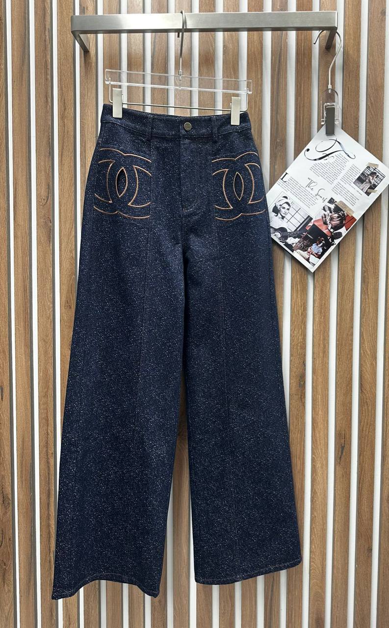 Джинсы Chanel – это стильный и современный элемент гардероба. Модель выполнена в тёмно-синем цвете с широкими штанинами, украшенными вышитыми логотипами бренда на карманах.