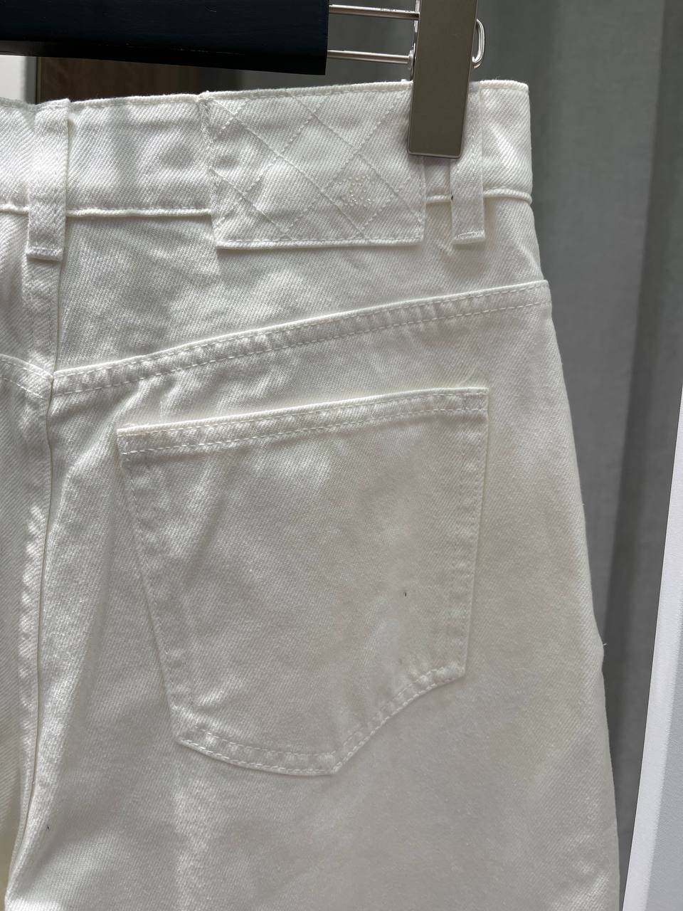 Джинсы Chanel LUX-118895 — это элегантные белые джинсы широкого кроя от известного бренда. Они выполнены из плотной ткани, имеют классический дизайн с пятью карманами. Отличительной чертой является отделка низа штанин в виде бахромы и жемчужных бусин.
