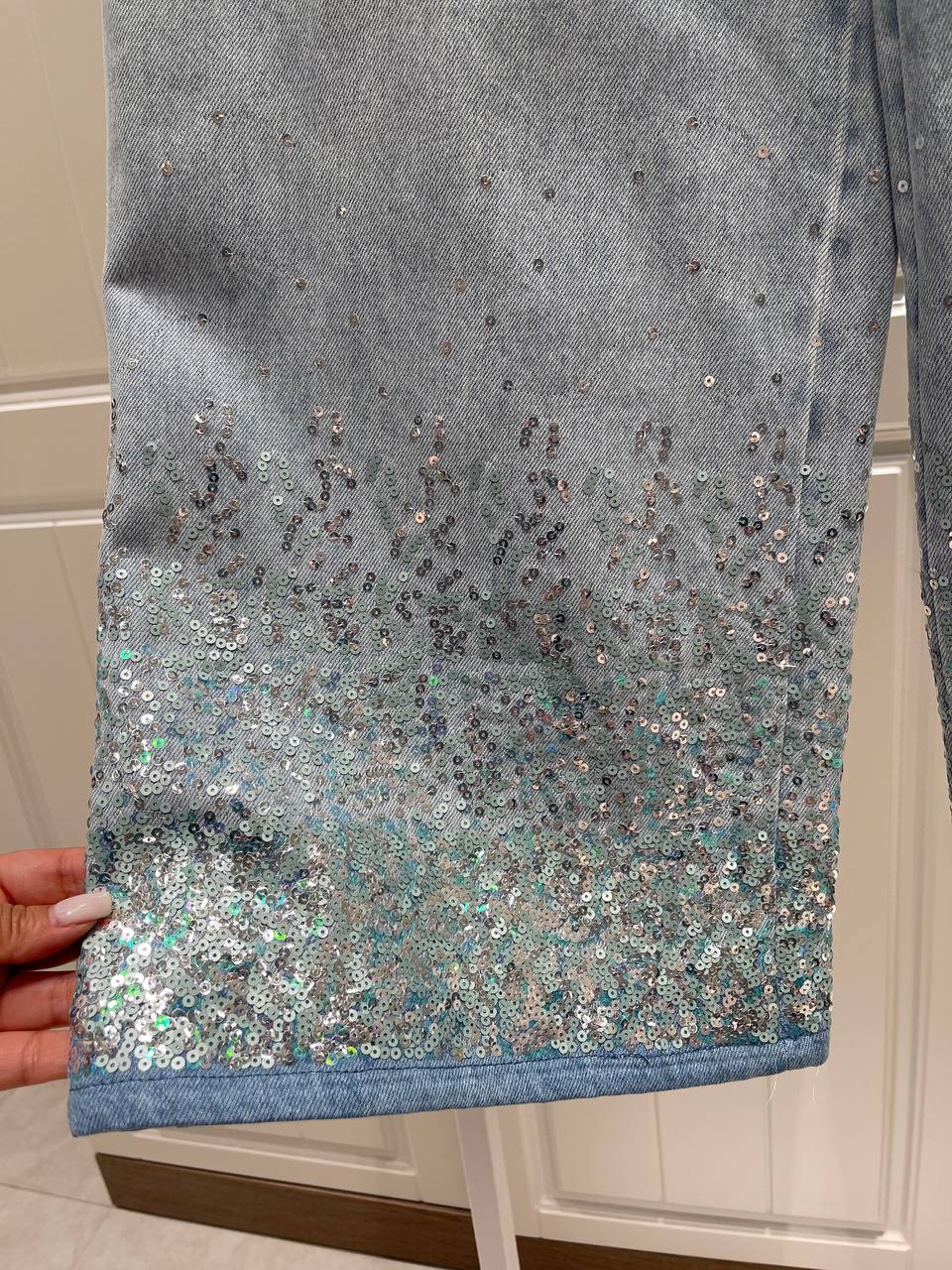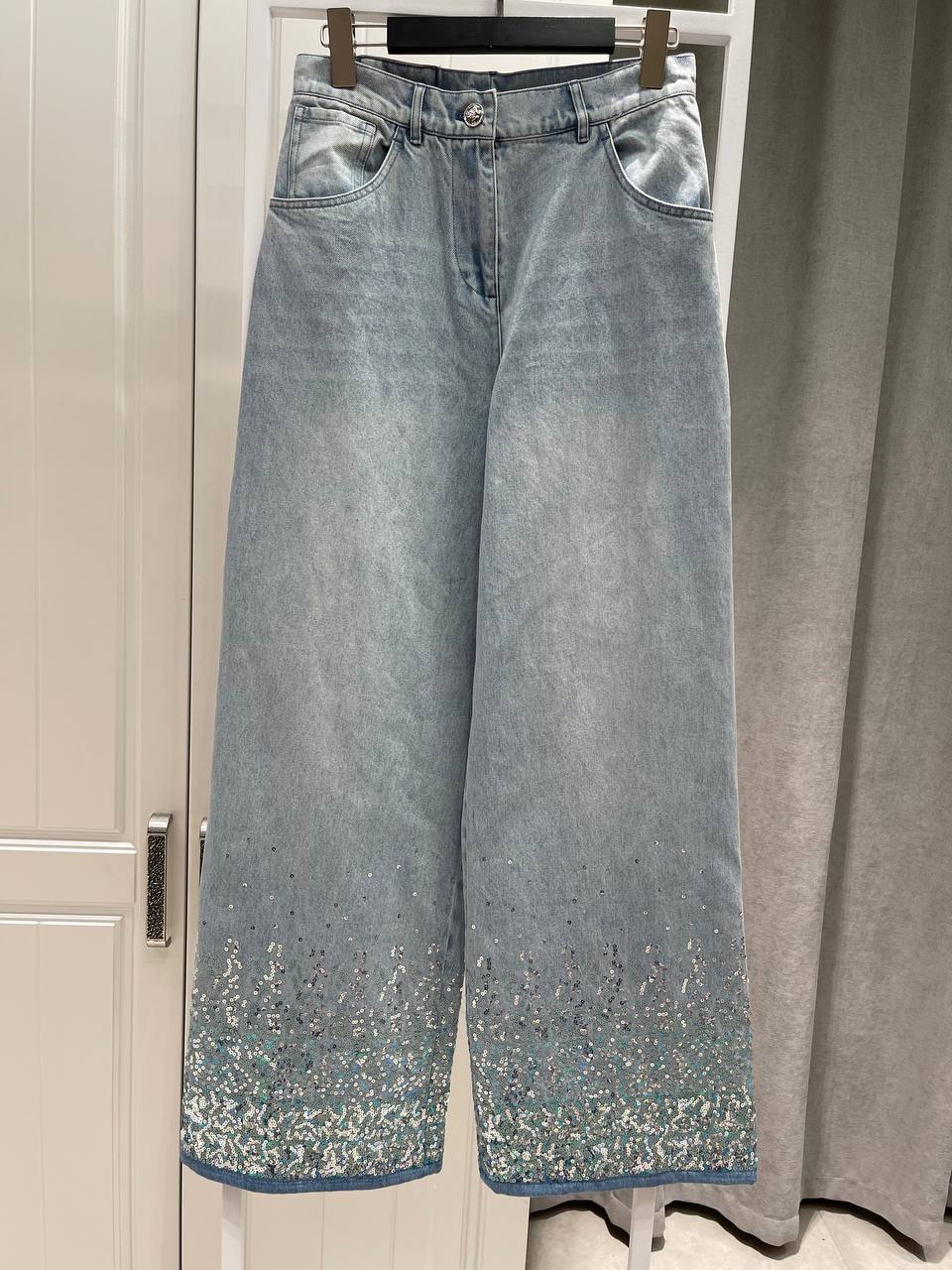 Джинсы Chanel LUX-119690 — это стильные джинсы свободного кроя, выполненные в светло-голубом цвете. Декоративные элементы, такие как блестки, расположенные вдоль нижнего края штанин, добавляют женственности и изысканности. Идеально подойдут для создания как повседневных, так и более нарядных образов.