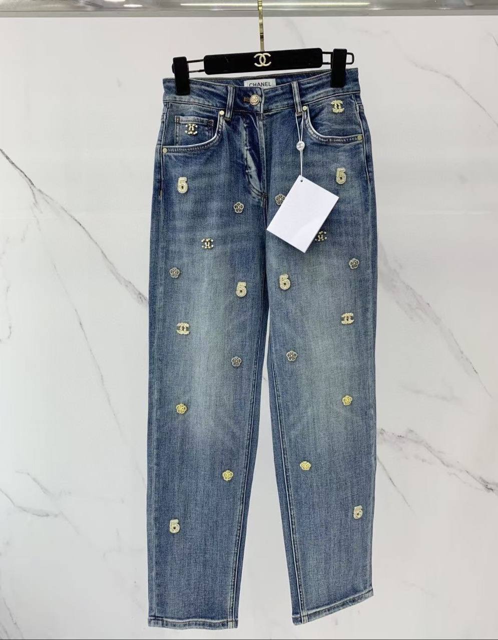 Эти джинсы Chanel LUX-67525 – стильное и элегантное дополнение к гардеробу. Они выполнены в классическом синем дениме и украшены изящной вышивкой в виде логотипа бренда и цифры "5". Прямой крой и средняя посадка делают их универсальным выбором для создания различных образов. Эти джинсы прекрасно подойдут как для повседневных прогулок, так и для более изысканных выходов.