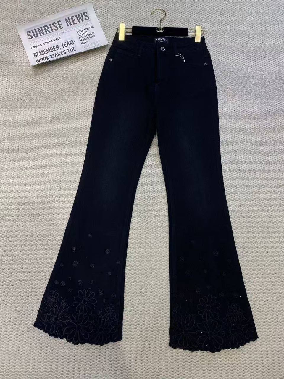 Джинсы Chanel – стильная модель, сочетающая в себе классический деним и изысканный декор. Расклешенный крой и оригинальная отделка в виде цветочных мотивов придают образу женственности и утонченности.
