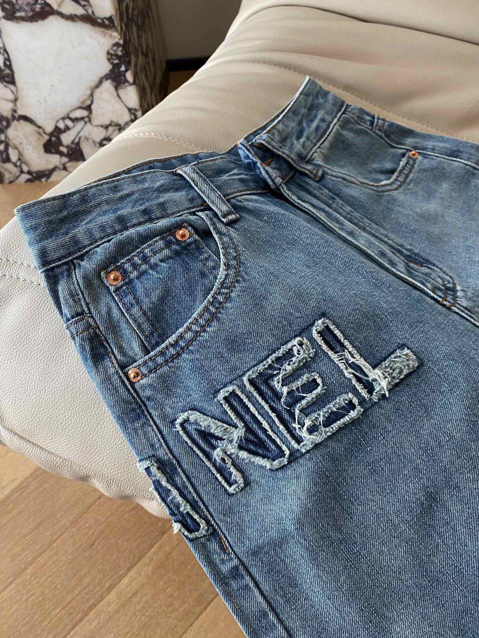 Джинсы Chanel LUX-90191 - это стильные джинсы прямого кроя. Они выполнены в светло-голубом цвете с потертостями, что придает им винтажный вид. Джинсы имеют надпись "NEL" на передней части кармана, добавляя узнаваемости и элегантности.