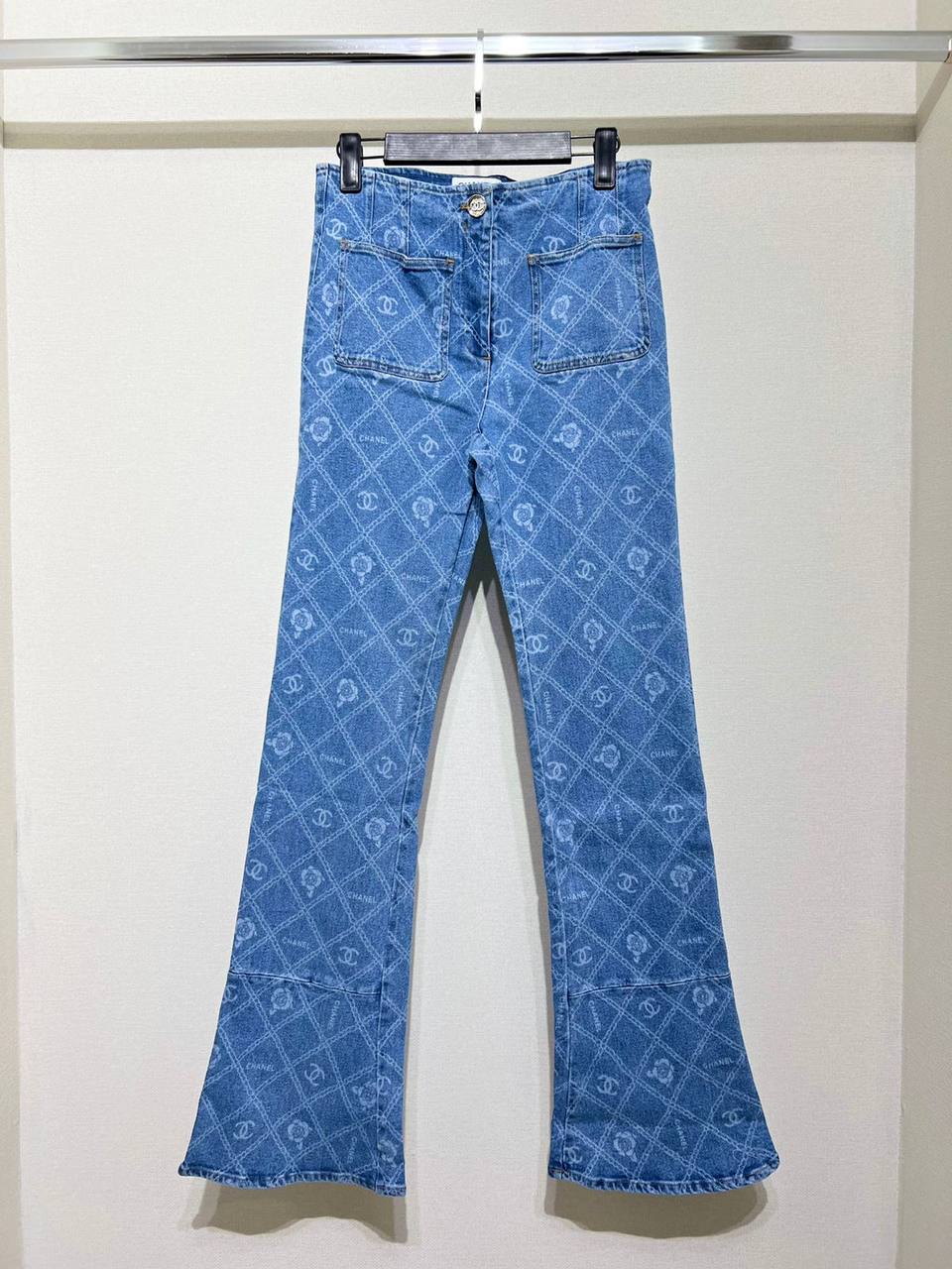Джинсы Chanel LUX-99273 — это стильные расклешенные джинсы, выполненные в классическом стиле от Chanel. Джинсы голубого цвета, украшены фирменным узором бренда. Эта модель подойдет для создания модных и элегантных образов.