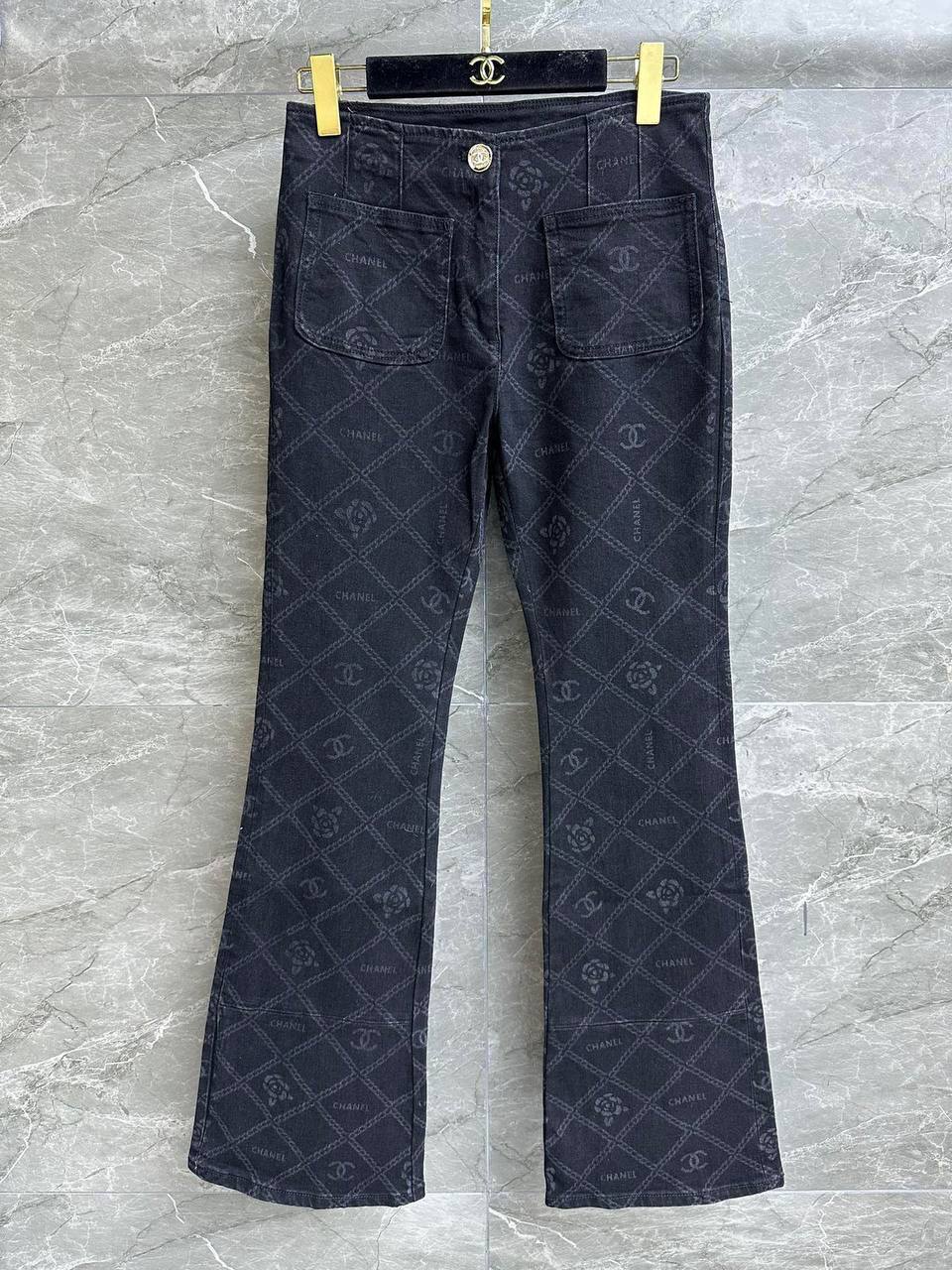 Джинсы Chanel LUX-99597 – это стильные расклешенные джинсы, выполненные в классическом стиле. Темный цвет и текстурный принт с логотипами бренда придают изделию элегантность. Джинсы подойдут для создания как повседневных, так и более формальных образов.