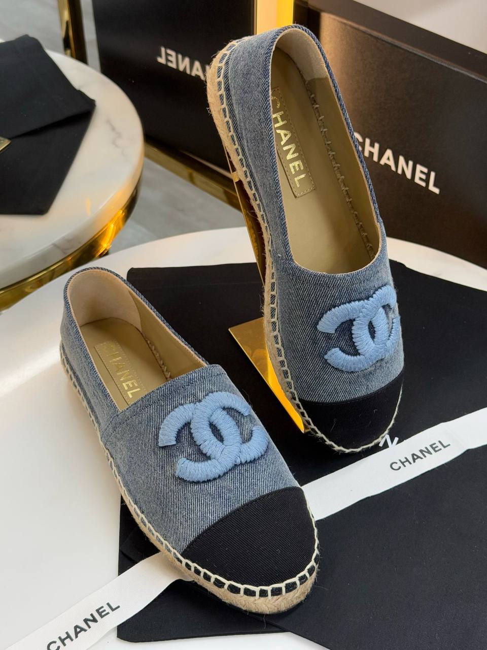 Эспадрильи Chanel LUX-117635 — это стильная летняя обувь, сочетающая в себе комфорт и элегантность. Эспадрильи выполнены в джинсовом стиле с контрастным черным носком и декорированы фирменным логотипом. Их дизайн подойдет для повседневной носки и может дополнить различные летние образы.