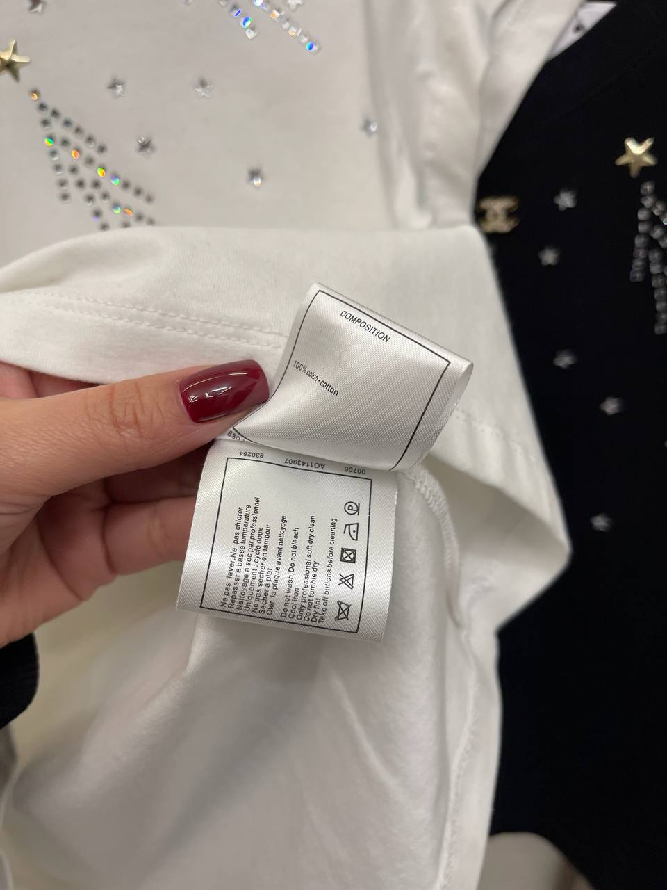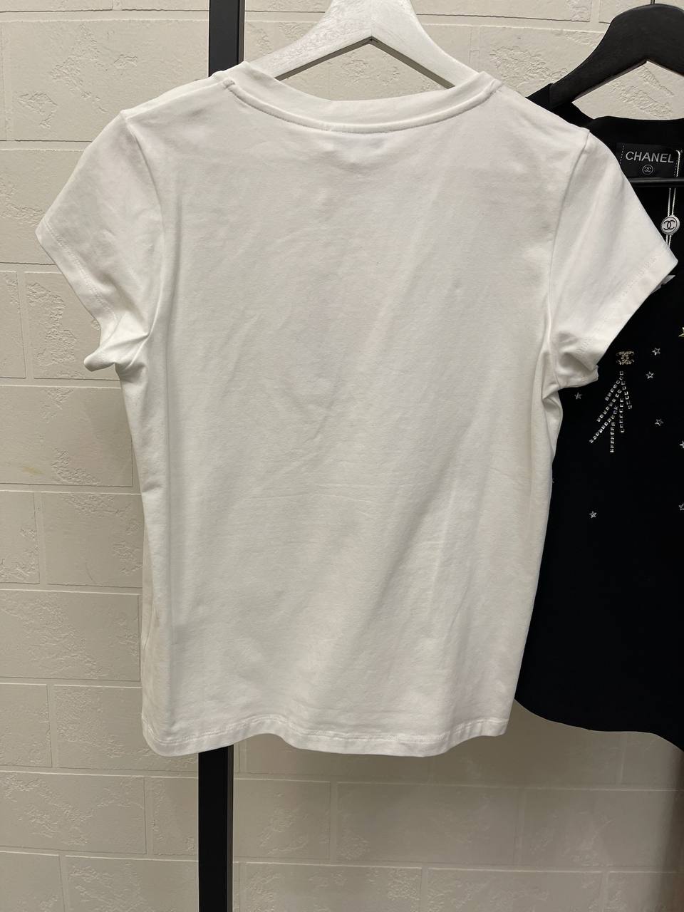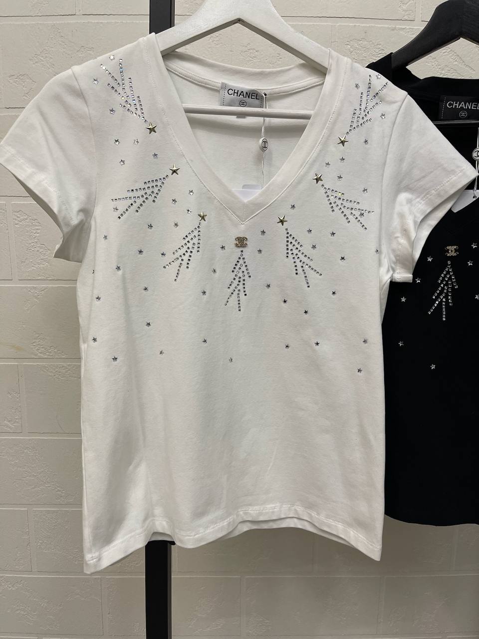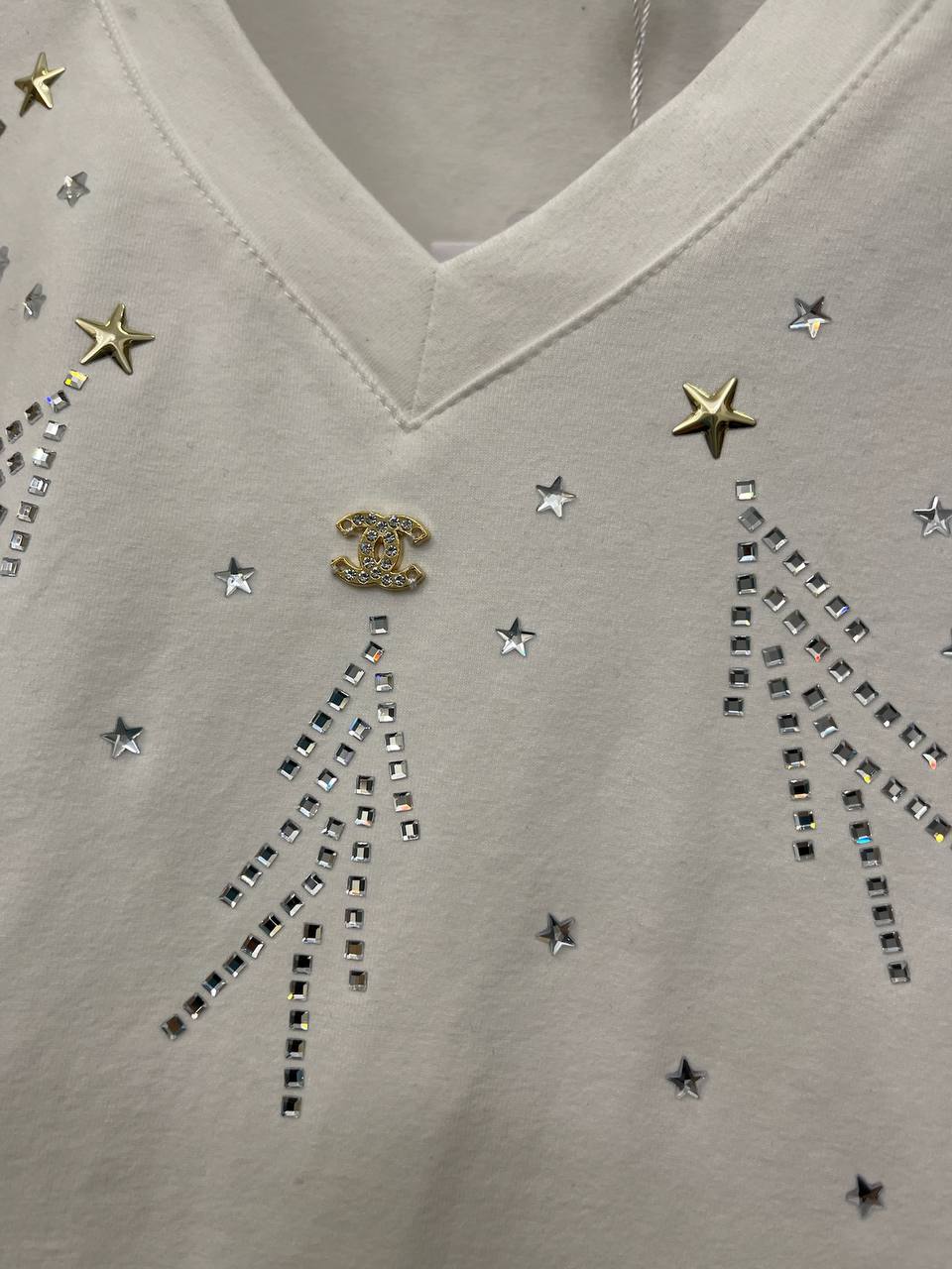 Футболка Chanel LUX-114593 выполнена в элегантном стиле и сочетает в себе узнаваемый дизайн модного дома. Белая футболка украшена сверкающими элементами, создающими яркий и запоминающийся образ. Эта футболка подойдет как для повседневной носки, так и для особых случаев, добавляя нотку роскоши в любой наряд.