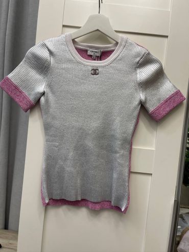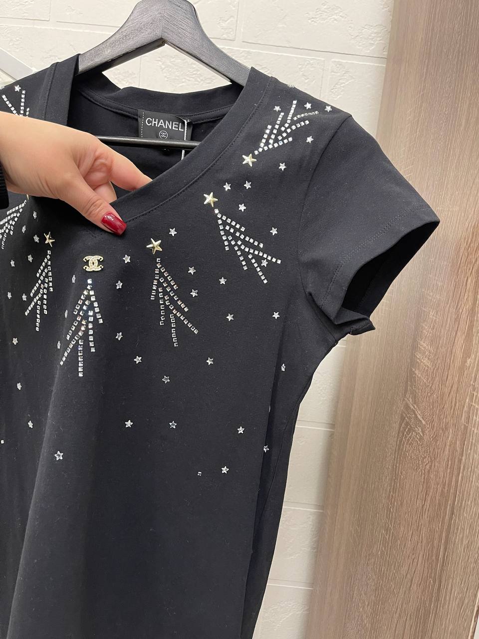Футболка Chanel LUX-114594 – это стильный предмет гардероба от известного бренда. Черная футболка с V-образным вырезом украшена декоративными элементами в виде звезд и логотипов, придающими ей элегантность и узнаваемость. Эта футболка идеально подходит для создания как повседневных, так и более нарядных образов.