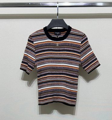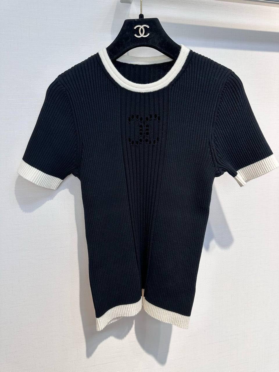Футболка Chanel LUX-115465 - это элегантный предмет гардероба от известного бренда. Футболка выполнена в классическом стиле с черным цветом основы и контрастной белой отделкой на воротнике и рукавах. На груди расположен фирменный логотип.