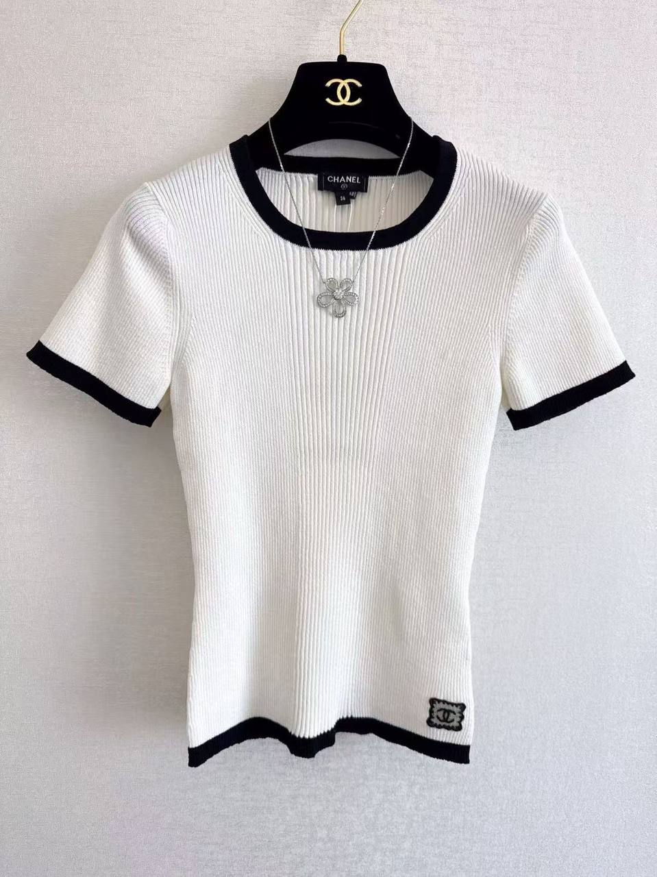 Футболка Chanel LUX-117327 представляет собой элегантный предмет гардероба в стиле casual, выполненный в классических цветах. Она имеет прямой силуэт, короткие рукава и круглый воротник. Черные детали на воротнике и рукавах, а также эмблема бренда добавляют изделию изысканности.