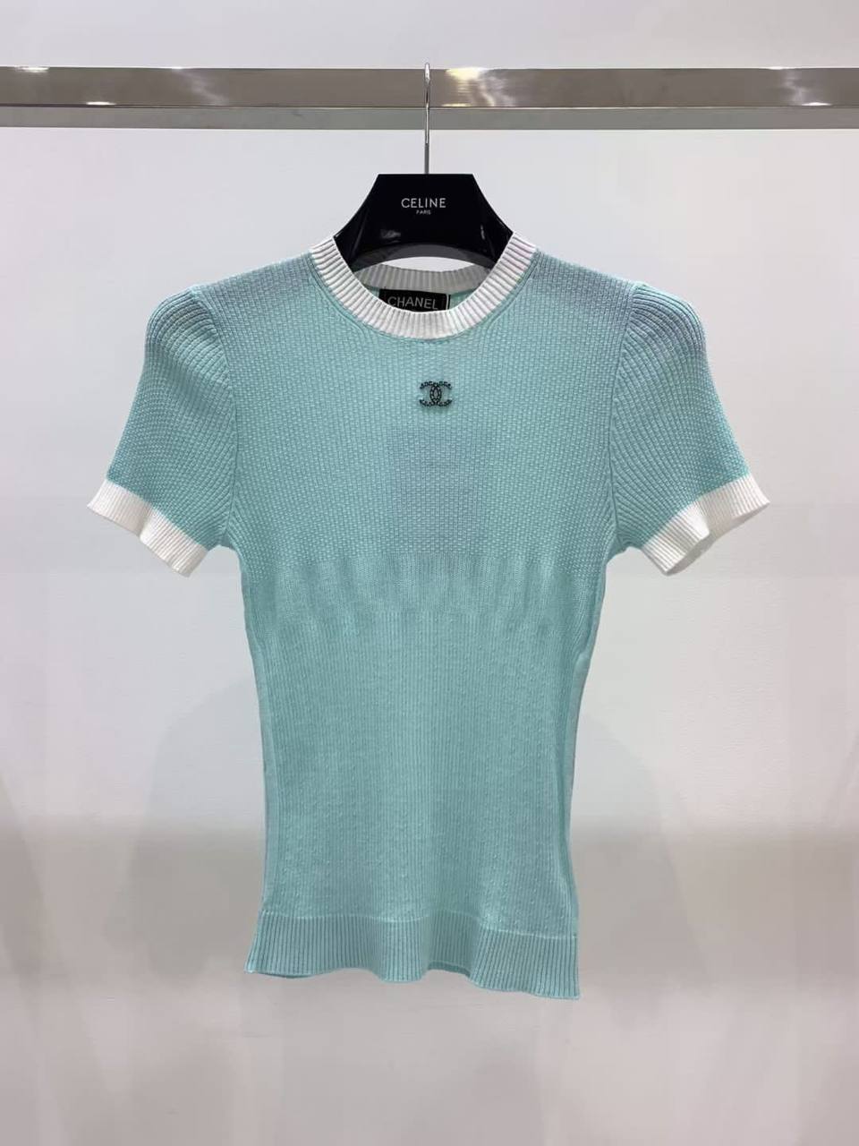 Данная футболка Chanel LUX-67132 выполнена в нежном мятном оттенке, дополненном контрастной белой отделкой по воротнику и рукавам. Её приталенный силуэт и короткие рукава делают её идеальным выбором для теплых дней, а элегантная фурнитура с логотипом бренда придает изделию изысканный вид. Эта модель прекрасно подчеркнет ваш стиль и добавит нотку роскоши в любой образ.