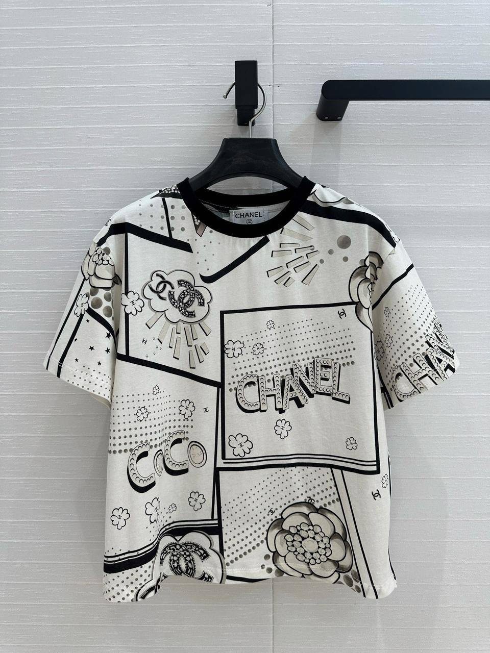 Футболка Chanel LUX-118929 представляет собой стильный предмет гардероба от известного бренда. Футболка выполнена в черно-белой гамме, имеет графичный принт с логотипами и элементами фирменного стиля Chanel. Отлично подойдет для повседневного использования, добавляя образу нотку элегантности и узнаваемости.
