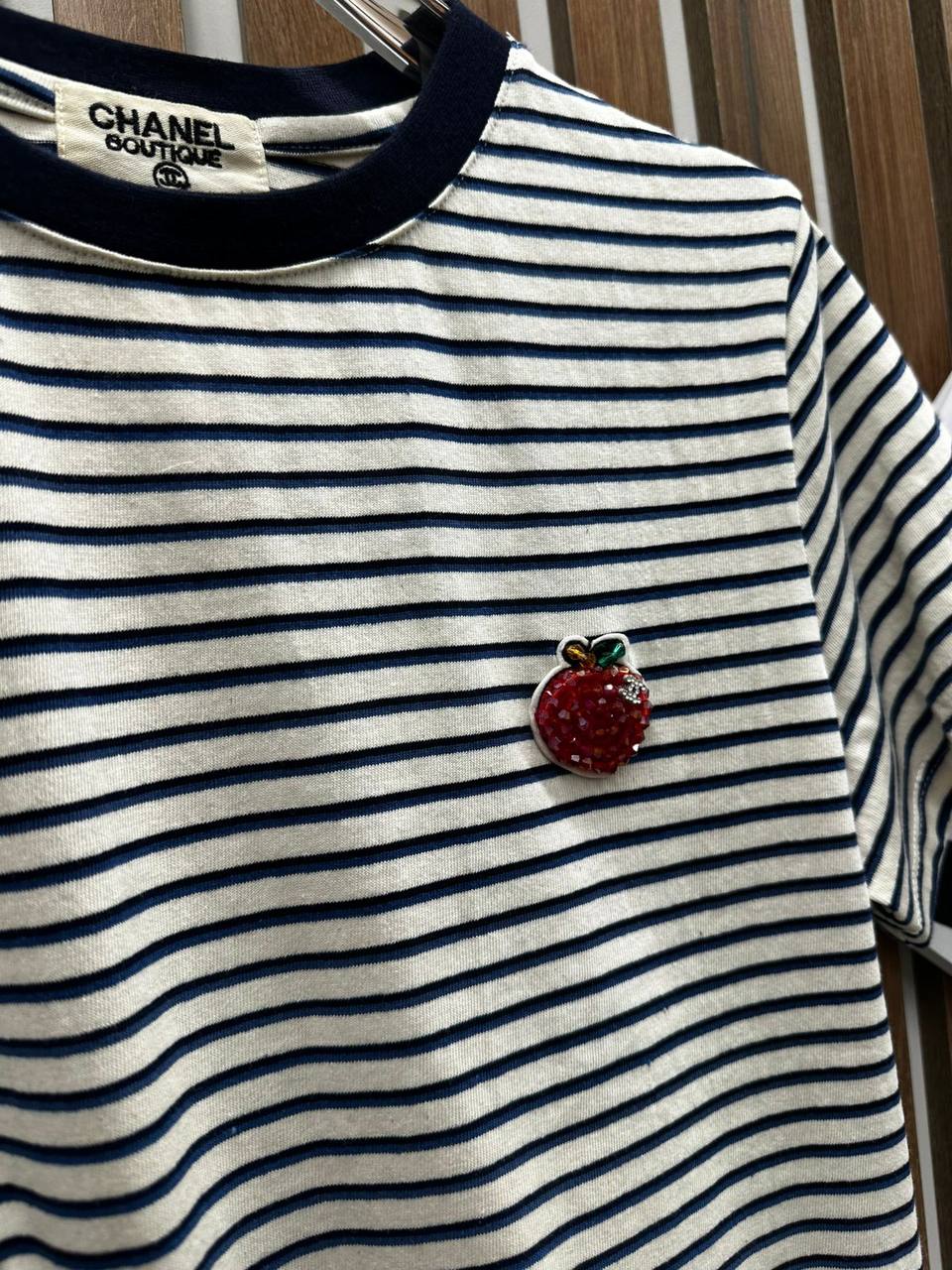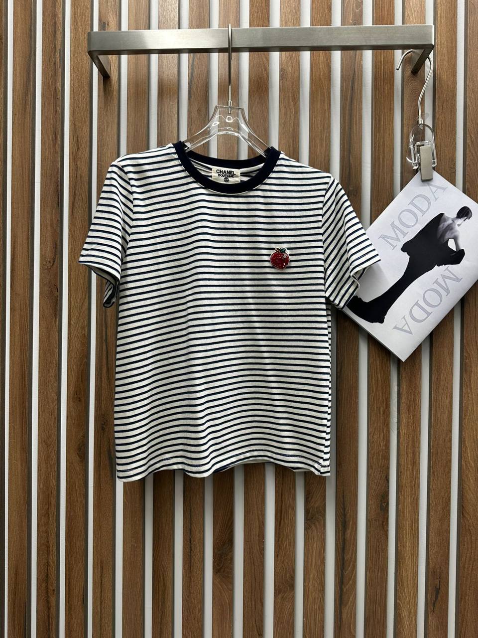 Представлена стильная футболка Chanel LUX-120648 в полоску, выполненная в классическом морском стиле. Идеальный вариант для создания непринужденных и модных образов.