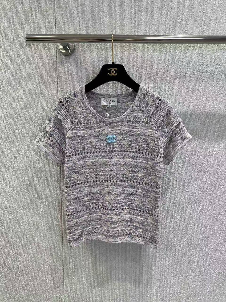 Футболка Chanel LUX-120916 – это стильная и элегантная модель от известного бренда. Трикотажная футболка с короткими рукавами, украшена ажурными вставками и логотипом бренда.