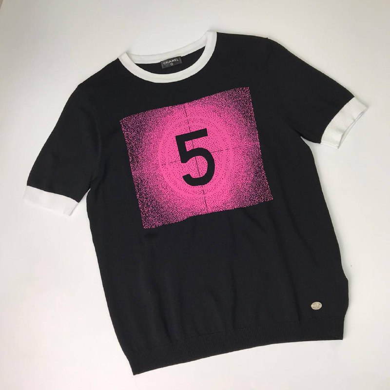 Эта футболка Chanel LUX-49598 — стильный элемент гардероба, сочетающий классический черный цвет с ярким принтом. Дизайн футболки отличается лаконичным силуэтом и контрастной отделкой на воротнике и манжетах. Изображение цифры 5 в розовом квадрате придает изделию оригинальность и узнаваемость.