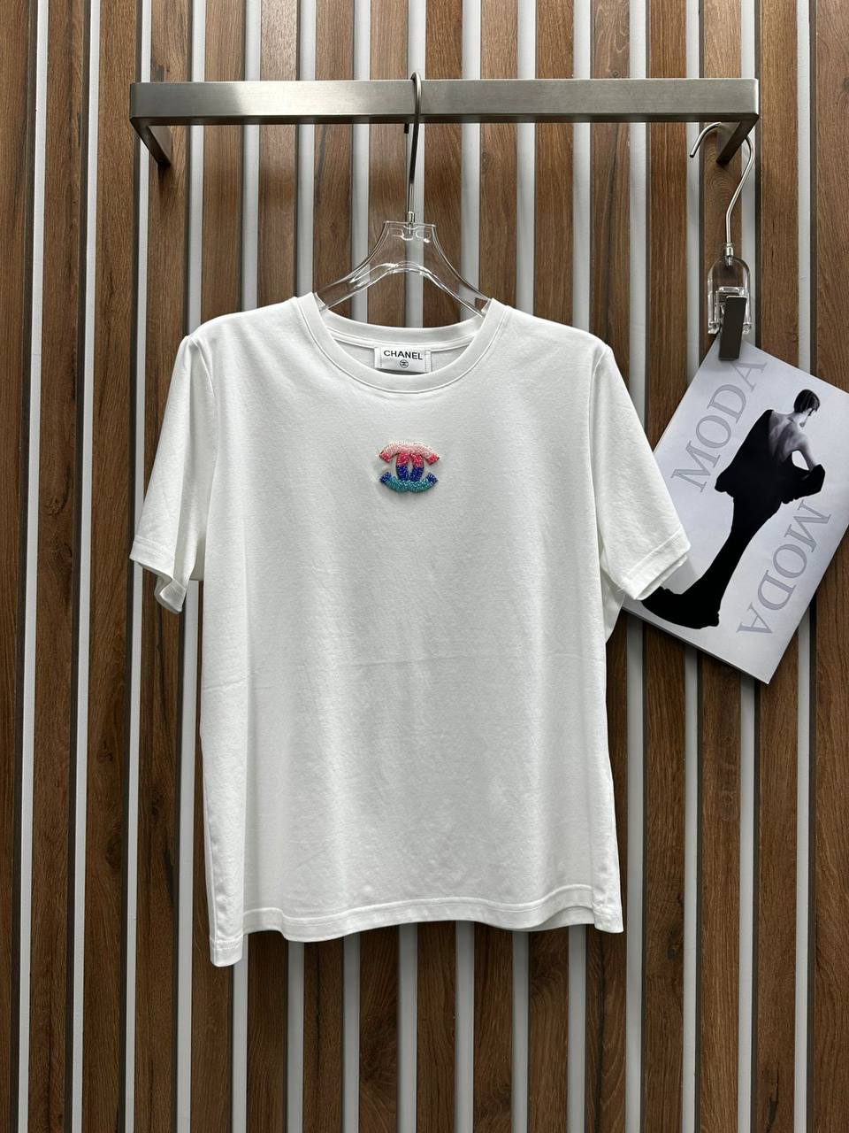 Стильная футболка Chanel LUX-121115 — это элегантное сочетание классики и современного дизайна. Она прекрасно подойдет для создания модного и комфортного образа на каждый день. Идеальный выбор для ценителей высокого качества и изысканности.