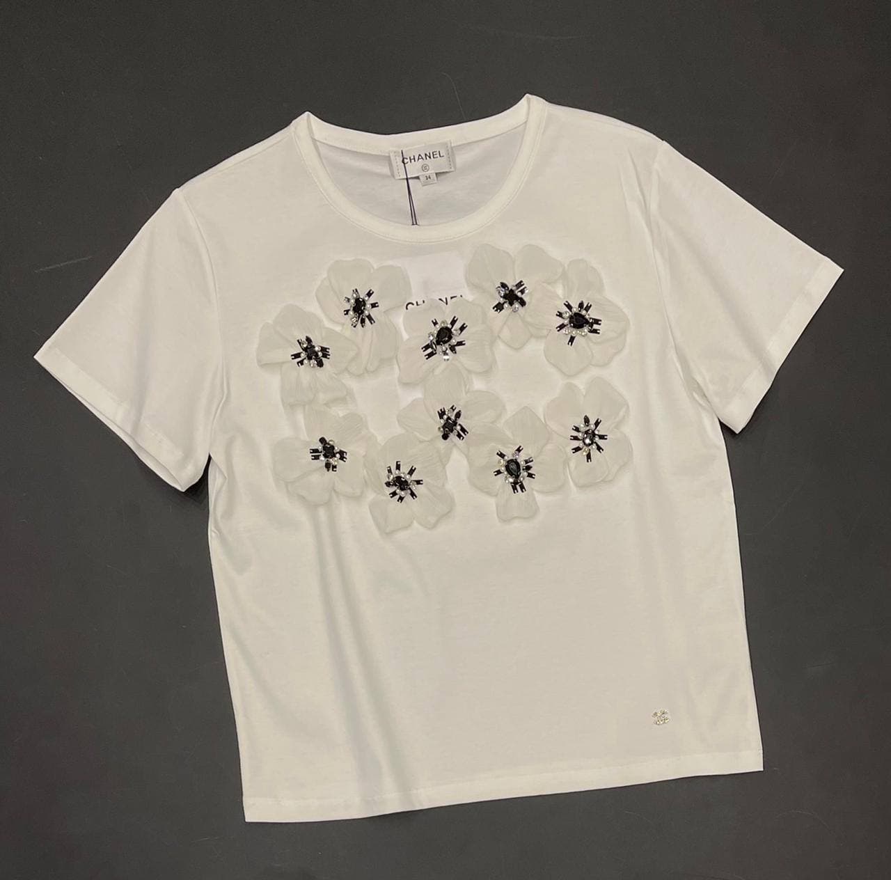 Белая футболка Chanel LUX-62569 — это изысканный элемент гардероба, сочетающий классический крой с утонченным декором. Она идеально подходит для создания элегантных повседневных и более нарядных образов. Благодаря объемным аппликациям в виде цветов с черными деталями и стразами, футболка приобретает неповторимый шарм и женственность.