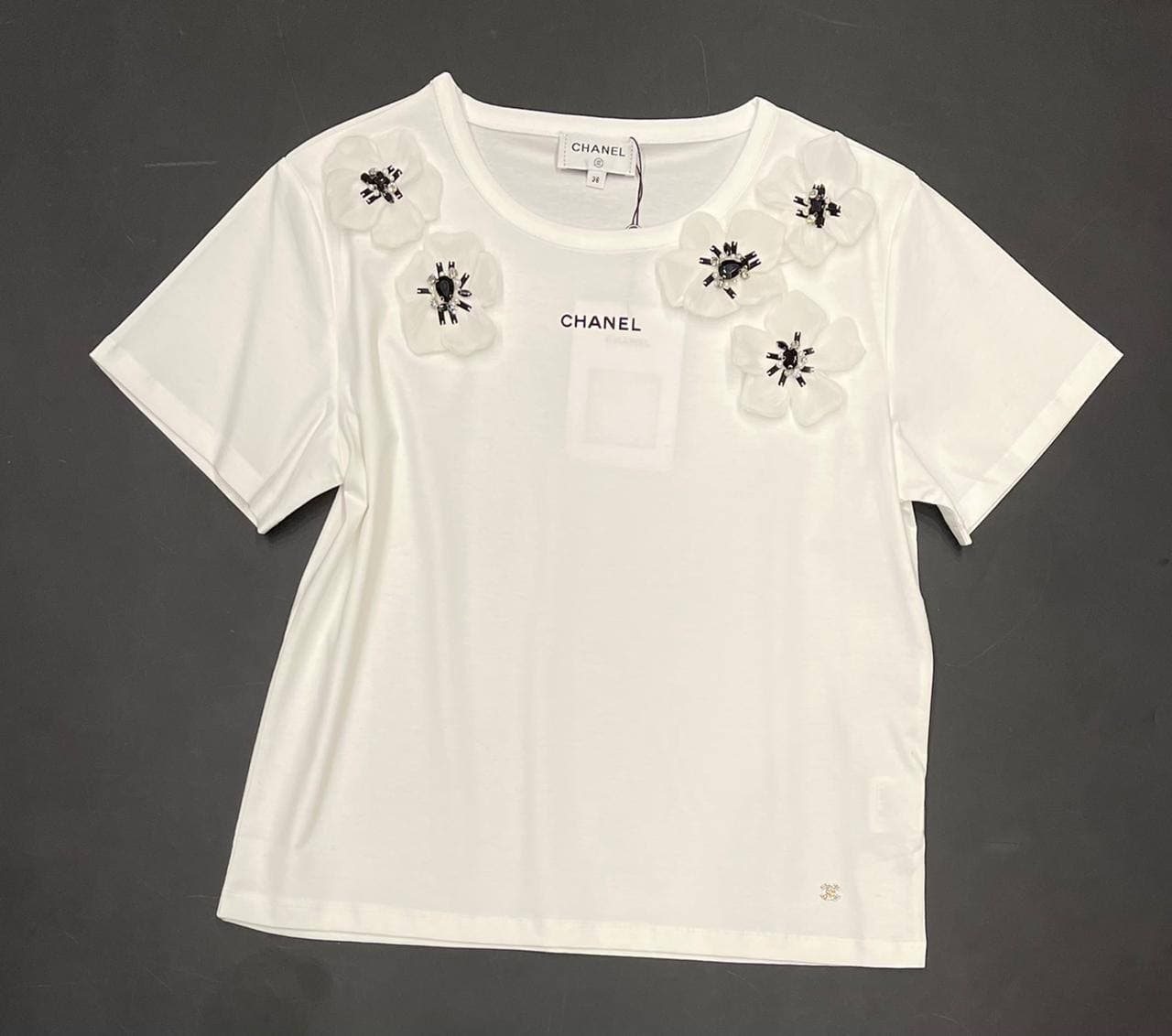 Chanel футболка LUX-62570 – это воплощение утонченности и элегантности, созданная для современных женщин, ценящих роскошь и комфорт. Эта белая футболка из высококачественного материала украшена объемными цветочными аппликациями, инкрустированными мелкими черными деталями, что придает ей неповторимый шарм. Логотип бренда ненавязчиво размещен на груди, подчеркивая эксклюзивность изделия.