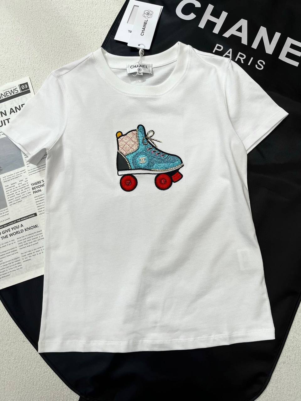 Футболка Chanel LUX-103263 — это элегантная белая футболка с уникальной аппликацией в виде роликового конька, сочетающая в себе современность и классику. Эта футболка подойдет для создания стильных образов в повседневной жизни, добавляя нотку изысканности и индивидуальности.