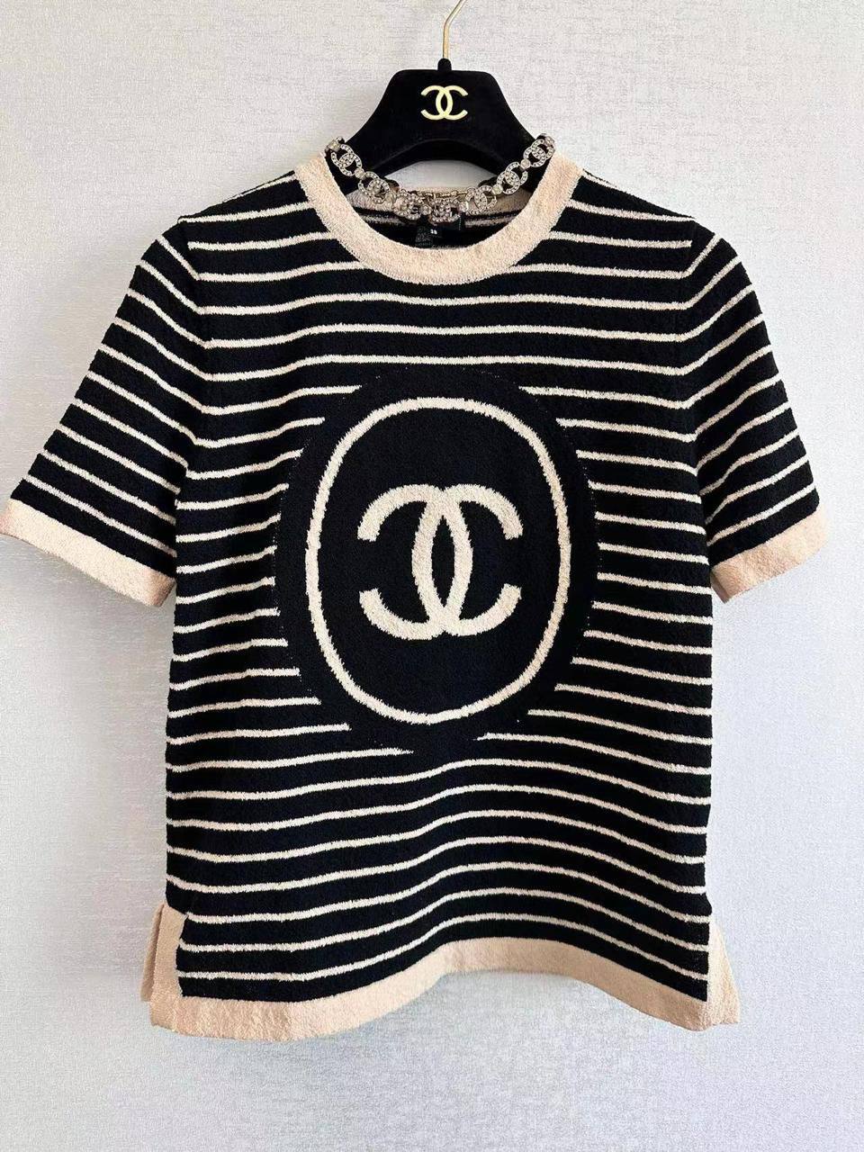 Футболка Chanel LUX-104571 – это воплощение элегантности и стиля от известного бренда. Черно-белая полосатая футболка с круглым вырезом и короткими рукавами. Центральным элементом дизайна является круглый логотип бренда.