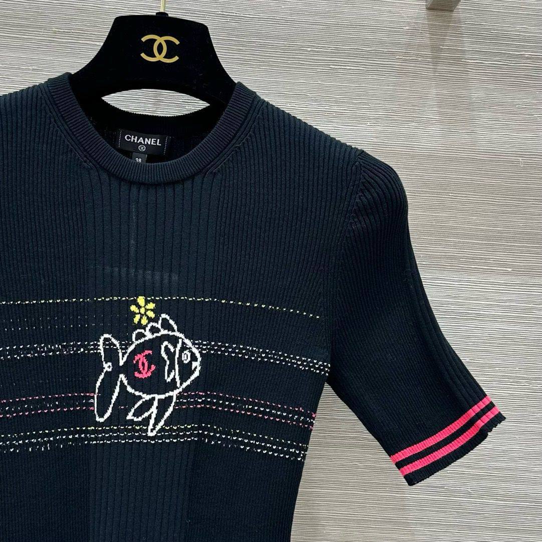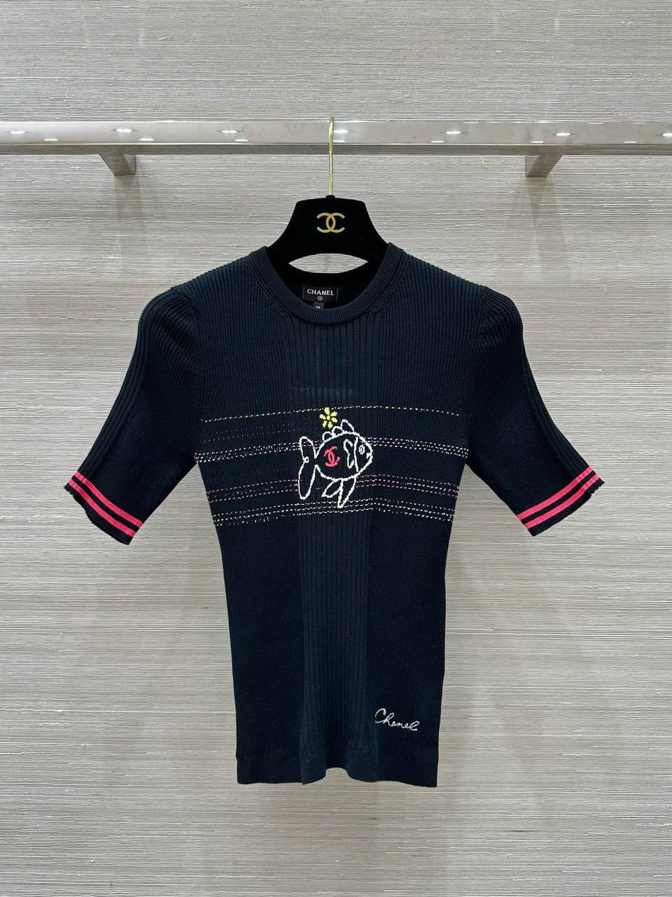 Футболка Chanel LUX-113079 – это элегантная трикотажная футболка от известного бренда, сочетающая в себе классический стиль и современный дизайн. Она выполнена в глубоком черном цвете, с контрастными деталями и изысканной вышивкой. Эта футболка станет отличным дополнением к повседневному гардеробу.