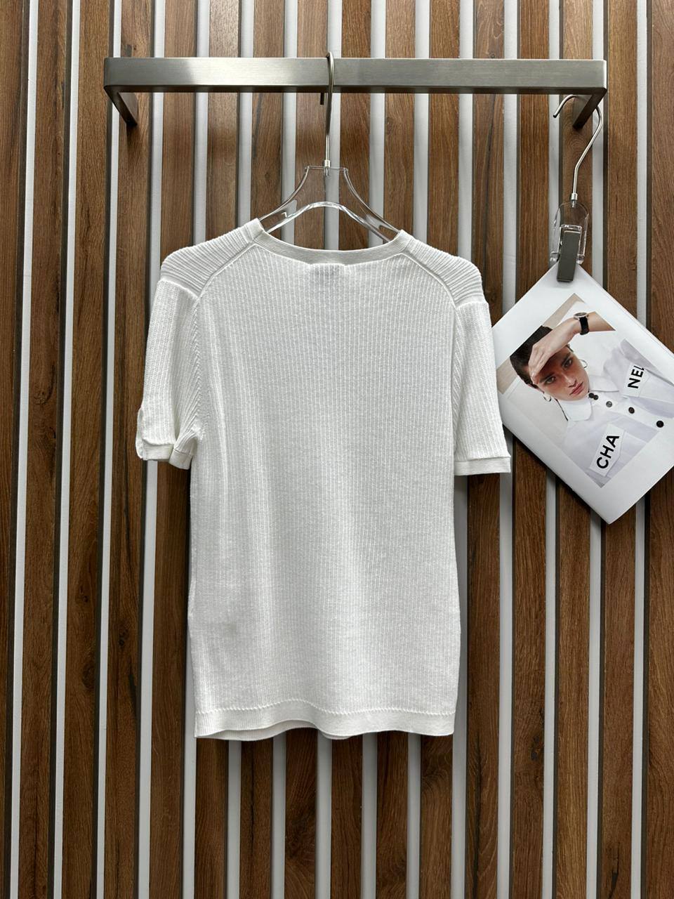 Футболка Chanel LUX-105442 выполнена в лаконичном стиле с акцентом на элегантность и женственность. Белая футболка из трикотажа, с короткими рукавами и небольшим карманом на груди. Прекрасный выбор для создания повседневных и стильных образов.